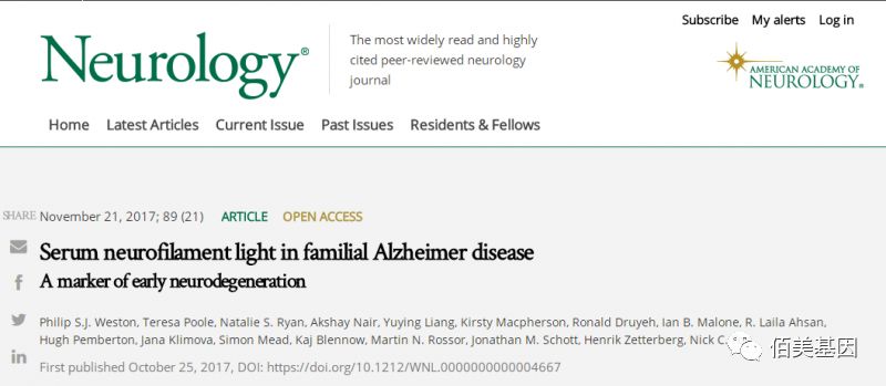 阿尔茨海默病(AD) 阿尔茨海默病(AD)是一种以智力缓慢丧失为特征的神经退行性疾病, 以记忆障碍、失语、失用、失认、视空间技能损害、执行功能障碍以及人格和行为改变等全面性痴呆表现为特征。其主要病理特征之一为神经细胞内出现大量神经纤维缠结。 我国现阶段有阿尔茨海默病患者约500万,到2020年我国患病人数将超过600万,我国65岁以上老年人群中每5个人里就有1个人有轻度认知障碍。阿尔茨海默病已成为全球老年人群中严重威胁的疾病。治疗阿尔茨海默病的关键在于早发现,阿尔茨海默病发病较为隐匿,很难察觉。往往患者从出现症状到首次确诊平均需要大于一年的时间,往往已经错过最佳的治疗时机。因此,在老年人群中,做好尽早筛查和诊断,采取干预措施,能够最大程度的赢取宝贵的治疗时间。 目前研究中,人们对其病因了解仍不透彻,尤其收集脑组织样本存在困难。临床诊断主要依赖于对认知水平的测试及对脑脊液中t-tau蛋白、p-tau蛋白、Aβ42、NfL相关蛋白的分析。虽然这些标志物在疾病的早期诊断上提供了高敏感性和特异性的方法,但它们收集困难,不适用于对疾病进程的跟踪。 超灵敏Simoa技术检测血清NFL以评估阿尔茨海默病 近期,伦敦和瑞典的科学家通过超灵敏Simoa技术,对家族性阿尔茨海默病进行研究,发现血清中NfL在症状出现之前升高,且与疾病分期和严重程度相关,暗示血清NfL可作为阿尔茨海默病早期神经退化的标志物,文章为《Serum neurofilament light in familial Alzheimer disease-A marker of early neurodegeneration》,发表在神经科学杂志Neurology上。 样本类型 选取有PSEN1或者APP突变的家族史的48人,其中18人为阿尔茨海默病患者,30人是未出现症状,携带突变的风险50%。所有参与者用sanger测序检测是否为携带突变。 选取有PSEN1或者APP突变的家族史的48人,其中18人为阿尔茨海默病患者,30人是未出现症状,携带突变的风险50%。所有参与者用sanger测序检测是否为携带突变。 研究方法 使用Simoa超灵敏免疫分析法,对血清NfL浓度进行定量分析。认知测试和核磁共振成像(MRI),并计算萎缩率。利用广义最小二乘回归模型比较症状突变携带者、症状前携带者和非携带者之间的血清NfL水平,并根据年龄和性别进行调整。Spearman系数来评估血清NfL与症状发作的估算年数(EYO)、认知测量、萎缩的MRI测量之间的关联。 1 测量者年龄、性别、认知测试、成像测量和NfL浓度等统计。 2 非突变携带者、症状前突变携带者、出现症状者,三组血清NfL水平。 3 在所有突变携带者中,血清NfL与EYO (r=0.81, p<0.0001 )显著相关,处于较晚疾病分期的具有较高的NfL浓度。圆点是突变携带者,叉号是非携带者。 4 在所有突变携带者中,血清NfL与多种认知和成像检测(MRI)相关,包括微型精神状态检查量表(Mini-Mental State Examination, MMSE) (r=-0.62, p=0.0001 )、临床痴呆评定量表(Clinical Dementia Rating Scale sum of boxes, CDR SOB)( r=0.79, p<0.0001 )、基线脑体积(baseline brain volume )(r=-0.62, p=0.0002 )和全脑萎缩率(whole-brain atrophy rate)(r=0.53, p=0.01 ),说明血清NfL可能与疾病严重程度或疾病进展相关。 5 生物标记与症状发作的估算年数(EYO)症状前相关性。 在症状出现之前,阿尔茨海默病中血清NfL浓度增加,且与疾病分期和严重程度相关,因此血清NfL可作为早期阿尔茨海默病相关神经退化的生物标记物。已有研究使用该技术测定了健康对照组和患者的血清NfL水平,结果显示,血清和脑脊液中的NfL水平存在显著相关性,提示血液采样可以代替脑脊液检测。 Simoa检测法与酶联免疫吸附试验(ELISA)和基于电化学发光法的试验相比,对NfL检出的敏感性分别高出126倍和25倍。既往只能在脑脊液中检测的神经标志物,利用Simoa技术可以在外周血中检测到,这改变了脑损伤和神经退行性疾病的诊断方式。 佰美基因联合美国Quanterix公司成立中国合作研究中心,将利用超灵敏免疫分析技术,在肿瘤早期检测、传染性疾病、心血管疾病、免疫炎症、神经系统疾病的新型生物标志物发现及血液筛查等方面,加大与临床多方合作,推动检验技术进步,助力精准医疗的发展。 [1].Philip S.J. Weston, Teresa Poole, Natalie S. Ryan, et al. Serum neurofilament light in familial Alzheimer disease A marker of early neurodegeneration. Neurology. 2017,89:2167–2175. [2].Nakamura A, Kaneko N, Villemagne VL, et al. High performance plasma amyloid-β biomarkers for Alzheimer's disease. Nature, 2018, 554(7691):249. |
