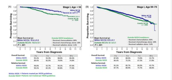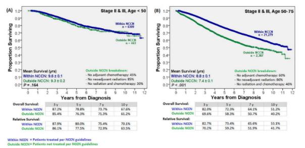 图2 50岁以上和50岁以下的II-III期直肠癌患者中,接受NCCN指南方案和未接受NCCN指南方案的中位生存时间 如图2所示,在II-III期、50-75岁的患者的预后中,NCCN指南中建议方案明显优于其他方案。 不过,对于小于50岁的患者,尽管分期及分化程度要差于老年患者,但NCCN指南建议方案并没有明显优于其他“简化”方案(无辅助放疗、新辅助化疗或放化疗)! 小于45岁患者中,NCCN指南获益劣于其他方案