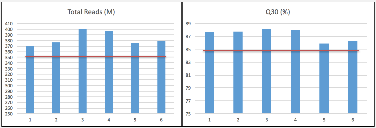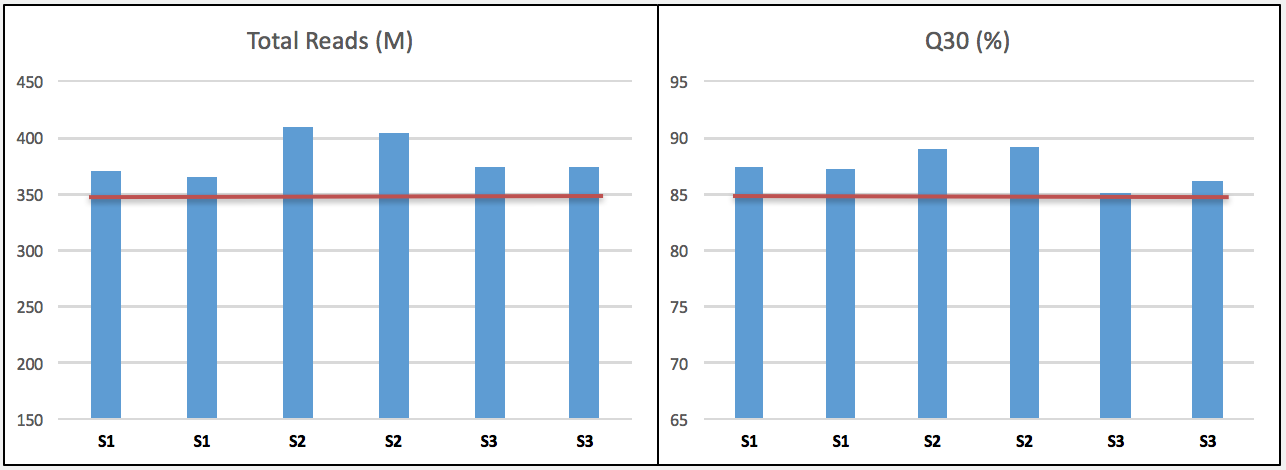 图1 相同机器-同批次试剂-同批次芯片间的重复性(统计6条lane) 数据量CV=3.24%,数据质量CV=1.13%