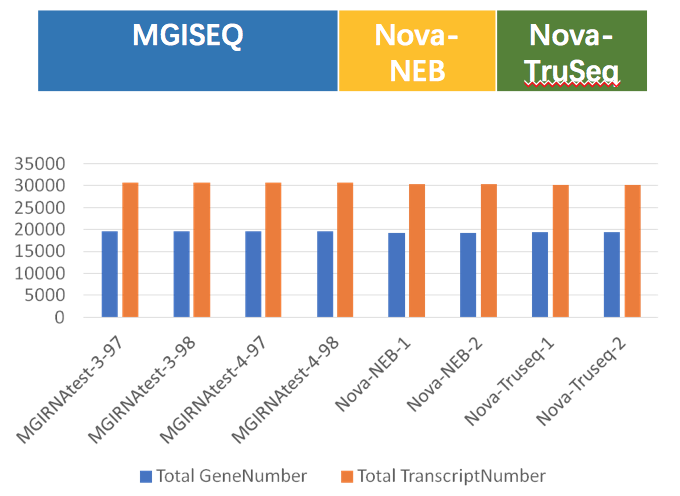 图7 测序平台间基因数量及转录本数量对比 在Gene number 和Transcript number 上,MGISEQ-2000平台与NovaSeq平台基本一致 在Spearman系数上,MGISEQ-2000平台与NovaSeq一致,在Pearson系数上,MGISEQ-2000平台较低,NEB kit相关性表现最好