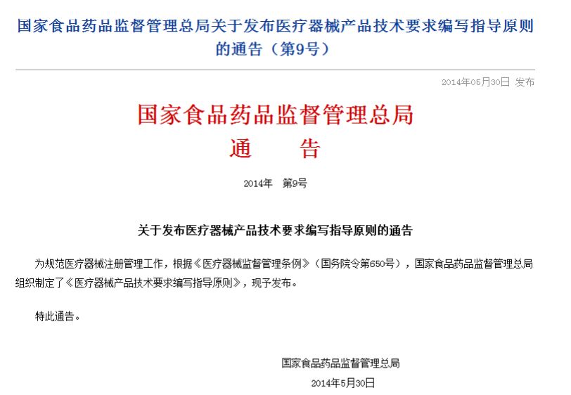 国家局发布的关于产品技术要求的通告 一、基本要求 (一)医疗器械产品技术要求的编制应符合国家相关法律法规。 (二)医疗器械产品技术要求中应采用规范通用的术语。 如涉及特殊的术语,需提供明确定义,并写到“ 4.术语”部分。 (三)医疗器械产品技术要求中的检验方法各项内容的编号原则上应和性能指标各项内容的编号相对应。 即2.1.1的性能指标应与3.1.1的检验方法对应。 (四)医疗器械产品技术要求中的文字、数字、公式、单位、符号、图表等应符合标准化要求。 比如血压单位Kpa和mmHg (五)如医疗器械产品技术要求中的内容引用国家标准行业标准或中国药、行业标准或中国药典,应保证其有效性,并注明相应标准的编号和年号以及中国药典的版本号 二、内容要求 (一)产品名称 产品技术要求中的产品名称应使用中文,并与申请注册(备案)的中文产品名称相一致。 (二)产品型号/规格及其划分说明。产品技术要求中应明确产品型号和/或规格,以及其划分的说明。 1) 对同一注册单元中存在多种型号和/或规格的产品,应明确各型号及各规格之间的所有区别(必要时可附相应图示进行说明)。 2) 对于型号/规格的表述文本较大的可以附录形式提供。对于型号规格的表述文本较大的可以附录形式提供。 (三)性能指标 1. 产品技术要求中的性能指标是指可进行客观判定的成品的功能性 、安全性指标以及质量控制相关的其他指标。产品设计开发中的评价性内容(例如生物相容性评价)原则上不在产品技术要求中制定。 如安全要求:符合GB9706.1-2007、XXXX、YY0505-2012等通用安全及专用安全的要求。 2. 产品技术要求中性能指标的制定应参考相关国家标准/行业标准并结合具体产品的设计特性、预期用途和质量控制水平且不应低于产品适用的强制性国家标准/行业标准。 3. 产品技术要求中的性能指标应明确具体要求,不应以“见随附资料”、“按供货合同”等形式提供。 四)检验方法 检验方法的制定应与相应的性能指标相适应。应优先考虑采用公认的或已颁布的标准检验方法。 检验方法的制定需保证具有可重现性和可操作性,需要时明确样品的制备方法,必要时可附相应图示进行说明,文本较大的可以附录形式提供。 如:工作条件(电源条件、环境条件) 与性能指标相对应 安全要求符合XXXX标准的要求。 对于体外诊断试剂类产品,检验方法中还应明确说明采用的参考品/标准品、样本制备方法、使用的试剂批次和数量、试验次数、计算方法。 (五)对于第三类体外诊断试剂类产品,产品技术要求中应以附录形式明确主要原材料、生产工艺及半成品要求。 (六)医疗器械产品技术要求编号为相应的注册证号(备案号)。拟注册(备案)的产品技术要求编号可留空。