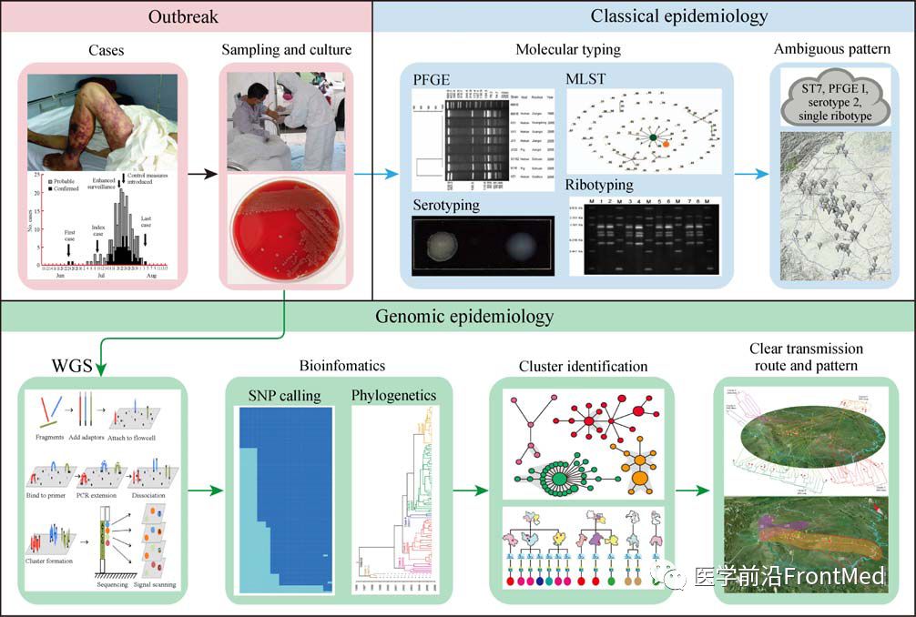 导读 在过去的十年里,借助基因组测序和数据分析技术的快速发展,使得细菌全基因组测序在常规监测实验室均可实现,也催生了细菌性传染病领域一个新的学科——基因组流行病学,以深入分析和解决传统流行病学和实验室手段不能解决的问题。中国疾病预防控制中心传染病预防控制所、传染病预防控制国家重点实验室徐建国院士、阚飙研究员团队于2018年1月9日在Frontiers of Medicine发表题为《全基因组测序改变细菌性传染病监测和调查模式》(Transforming bacterial disease surveillance and investigation using whole-genome sequence to probe the trace)的综述文章,阐述全基因组分型溯源技术在细菌性传染病监测和调查中的应用,提出病原细菌全基因组测序技术及其网络化和信息化的布局正在转变细菌性传染病的监测预警模式。 为了读者能快捷全面地了解相关科研进展,作者团队对这一综述做了翻译精编,内容全面,细节详实。全文2398字,读后有收获,有启发。点击篇末“阅读原文”,可阅读和下载英文综述全文。 导言 自从利用新的测序策略获得第一株细菌全基因组,至今已过去二十年,这期间,基因组测序和信息分析技术仍展现出了快速的发展,测序方法和序列读长都在迅速改善,原始测序与组装质量、序列数据挖掘分析策略和算法不断优化。通过微生物基因组序列比对分析,能够准确获得变异特征,这些序列变异特征可作为识别不同亚型的生物标记,并据此分析不同菌株间的遗传变异关系,为数字化重构菌株间的流行病学关联程度建立了分子基础。基因组信息在传染病监测和暴发调查研究中的应用可被定义为:根据基因组信息分析病原菌分离株之间的分子流行病学关系,结合社会信息、自然与地理信息等,重构传播链,协助分析解释传染病的发生和扩散,对疫情进行溯源,进而明确传染病的发生模式(图1)。目前分离株基因组比对主要有两种方法,分别是基于序列的全基因组/核心基因组单核苷酸多态性(SNP)、基于来自全基因组/核心基因组的多位点序列分型(MLST)。利用病原细菌分离株的基因组序列,可在下述几个方面发挥作用。 图1 细菌性传染病暴发调查和监测分析中基因组流行病学研究的一般流程。