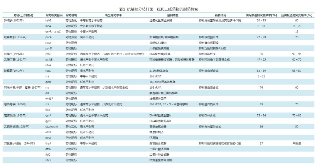 2.MTB的耐药主要是药物作用靶基因突变引起的[21,22]。根据耐药基因的功能不同,可分为药物靶标基因及参与药物活化的基因两种[22];不同抗结核药物的耐药相关基因在耐药突变菌株中发生的频率差异较大,且引起的耐药水平差异也较大,基于目前MTB分子生物学研究进展,将不同药物的主要耐药相关基因、功能、耐药水平及突变频率进行了总结(表1)[21]。