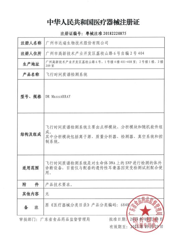 2018年9月30日,达瑞生物申报的飞行时间质谱检测系统(粤械注准:20182220875)正式通过广东省食品药品监督管理总局的注册申请。这是国内首台获批可直接检测核酸的飞行时间质谱系统。