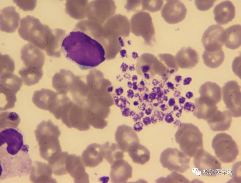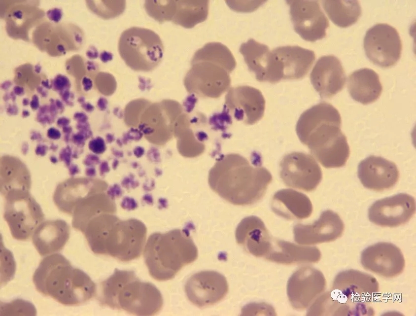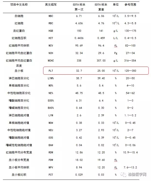 案例经过 今年5月份,某日上午,临检组同事发现有一例门诊患者血常规结果显示血小板明显减低32.7×109/L,而其它参数无明显异常,复查后血小板结果为25.0×109/L(见表1)。患者为门诊初诊患者,可提供的临床资料有限(患者男性,59岁)。 ![]() 表1 患者两次血常规检查结果 于是我们对标本进行血涂片复检。瑞士-吉姆萨染色、镜检,在涂片中发现血小板成簇、成堆分布(如图1,2)。而一般EDTA抗凝血涂片,因有抗凝剂存在,血小板不会聚集,而是呈星星点点散分布(图3);如果患者血小板数量并不少,在末梢血直接涂片才可观察到血小板成簇、成堆分布(图4)。患者外周血分类结果:白细胞分类大致正常,成熟红细胞形态未见异常;血小板成簇、成堆分布。这样排除了引起血小板减少的相关疾病,更考虑患者是一例EDTA依赖性假性血小板减少。
