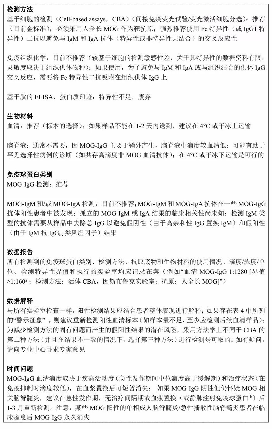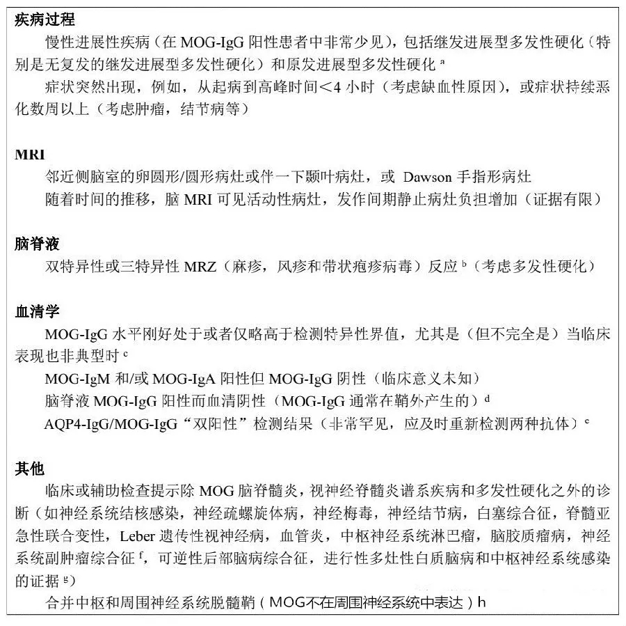 今年5月份,Journal of neuroinflammation杂志发表了有关MOG脑脊髓炎诊断和抗体检测的国际推荐意见,本文首次基于专家共识提出MOG-IgG的检测时机和指征。此外,文中列出了一些被认为是非典型MOG-EM(“警示征象”)的情况,其出现应促使临床医生对MOG-IgG阳性检测结果的正确性提出质疑。最后,对检测方法学、标本取样和数据解释给出推荐。 关于MOG-IgG检测的建议 在表1中,基于典型MOG-EM和/或非典型MS的临床表现和辅助检查结果提出MOG-IgG检测的指征,专家共识小组成员讨论后认为,需要足够高的验前比(pre-test odds,检查前病人患某种疾病的机率)来证实MOG-IgG检测合理性或MOG-IgG检测需求,因阳性结果可能对治疗结果产生重要影响。 这些推荐适用于所有疑似自身免疫因素所致的单相或复发病程的CNS脱髓鞘疾病患者。鉴于验前概率(pre-test probability,即检查前病人患某种疾病的可能性)很低,不建议在疾病进展期进行普通MOG-IgG检测。 表1 考虑自身免疫性急性中枢神经系统脱髓鞘患者的MOG-IgG检测推荐指征 备注:该推荐主要适用于成人和青少年。因MOG-EM在获得性脱髓鞘疾病患儿(可多达70%,发病率随着年龄增长而下降)中明显多于成人(西方国家≤1%;由于MS患病率较低,在日本和其他亚洲国家可能≤5%),因此儿童行MOG-IgG检测的指征不需要像成人那样严格,也降低了概述中提及的抗体筛查风险。(a-l的解释略) 检测选择、标本取样和数据解释相关推荐意见详见表2。 表2 关于方法学、检测参数、标本取样和数据解释的推荐 备注:a 注意这里给出的界值只是一个例子;实际的界值依赖于检测;b 通常静脉注射免疫球蛋白治疗后易导至抗体检测假阴性和假阳性结果;但迄今为止还没有关于目前用于MOG-IgG的任何检测方法是否会受到静脉注射免疫球蛋白治疗影响的研究。 MOG-EM不典型的表现(“警示征象”)见表3,其出现将促使临床医生质疑MOG-IgG阳性检测结果,并积极为患者的临床症状和辅助检查结果寻求更好的解释。 备注:可考虑重新检测,理想情况下使用替代手段,即方法学上不同于CBA的检测方法;如有疑问,可考虑向专业中心寻求专家意见。(a-h的解释略) 临床实践中,许多根据2015年NMOSD国际共识诊断标准诊断的AQP4-IgG阴性NMOSD患者也将满足表1中给出的MOG-IgG检测指征,因此应对其进行相关检测。但MOG-IgG检测不应局限于AQP4-IgG阴性的NMOSD患者。我们建议对所有长节段横贯性脊髓炎患者以及具有MOG脑脊髓炎典型临床和影像学特点和/或非典型多发性硬化表现的疑似中枢神经系统脱髓鞘患者行MOG-IgG检测(参见表1)。 在达成共识的过程中,专家们提出了以下与治疗有关的MOG-IgG检测适应症:①对抗体消除疗法(血浆置换,免疫吸附)反应特别好;②对B细胞耗竭疗法(利妥昔单抗,Ocrelizumab,奥法木单抗)反应特别好,但在B细胞再次出现后立即复发。 尽管专家组的一些成员认为,在经典的多发性硬化中也可观察到对血浆置换,免疫吸附或B细胞耗竭疗法反应良好的。但现已经达成一致意见,除了表1所列出的检测指征之外,如存在对抗体、B细胞耗竭治疗或静脉注射免疫球蛋白反应良好的患者,罹患MOG脑脊髓炎的可能性增加,建议行MOG-IgG检测。 MOG-IgG血清滴度与疾病活动(急性发作期滴度较高)、治疗状态(免疫抑制时滴度较低)以及检测灵敏度等有关,我们建议在急性发作或非治疗间期和/或第2次基于细胞的检测仍为阴性,但基于表1所列内容仍怀疑MOG脑脊髓炎时重新检测MOG-IgG。 研究表明,MOG-IgG滴度中位数在复发期明显高于缓解期,因此定期行MOG-IgG检测可作为预测发作和监测治疗效果的潜在有效方法。但一部分患者在急性发作期滴度仍然相对较低,而另一部分患者在缓解期间滴度却相对较高。目前尚无定期MOG-IgG滴度检测用于复发预测或治疗监控的一般建议。 值得注意的是,有报道部分患者的MOG-IgG抗体随着时间的推移而消失。有趣的是,这些患者大部分为单相病程。初次发作后MOG-IgG消失可能提示预后,因此MOG-IgG阳性患者在首次发作后6-12个月重新检测可能有必要。但仅根据MOG-IgG在第一次发作后是否消失来做出长期治疗的决定具有挑战性。 如果长期的免疫抑制剂或口服类固醇激素治疗在血清转阴后停用,强烈建议密切监测患者的血清MOG-IgG,以确认其阴性的持久性。在下“单相”MOG脑脊髓炎诊断并做出长期治疗决定之前,还应考虑到复发性MOG脑脊髓炎的第1次和第2次发作间隔有很大的个体差异。 MOG脑脊髓炎的诊断标准 MOG脑脊髓炎的诊断标准尚未完善。然而,并没有在所有MOG-IgG阳性患者中发现特异性临床表现或影像学改变(除中枢神经系统脱髓鞘疾病的一般要求外),因此缺乏诊断的必要条件。典型的MOG脑脊髓炎无MRI上的Dawson手指征和卵圆形/圆形病灶,但需进一步研究证实。我们建议目前所有符合以下所有标准的患者均应诊断为MOG脑脊髓炎: 1. 单相或复发性急性视神经炎、脊髓炎、脑干脑炎或脑炎,或这些综合征的任何组合; 2. MRI或电生理(孤立性视神经炎患者的视觉诱发电位)结果与中枢神经系统脱髓鞘相一致; 3. 通过使用人全长MOG作为靶抗原的基于细胞的检测证实血清MOG-IgG阳性。 存在表3中所列内容,被认为具有“警示征象”的患者,如果在方法学不同于基于细胞检测的第2次(必要时第3次)检测中仍未能发现MOG-IgG,应诊断为“可能的MOG脑脊髓炎”,特别是在临床研究和治疗试验的背景下。 局限性和注意事项 由于缺