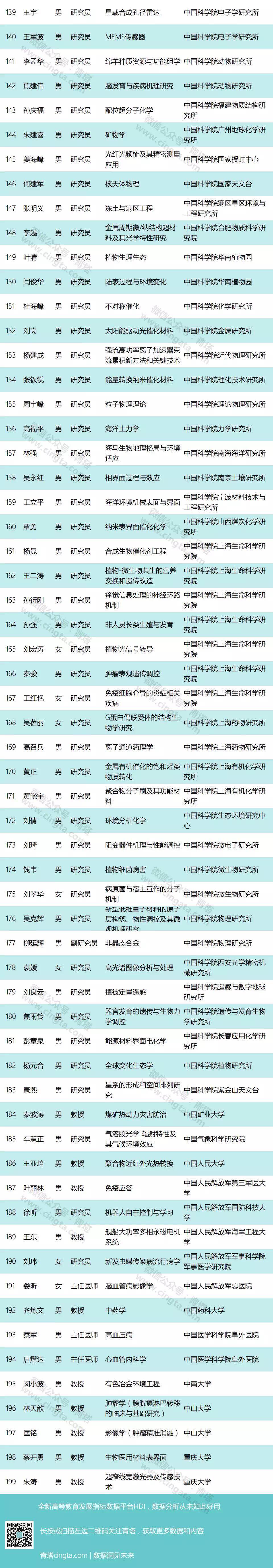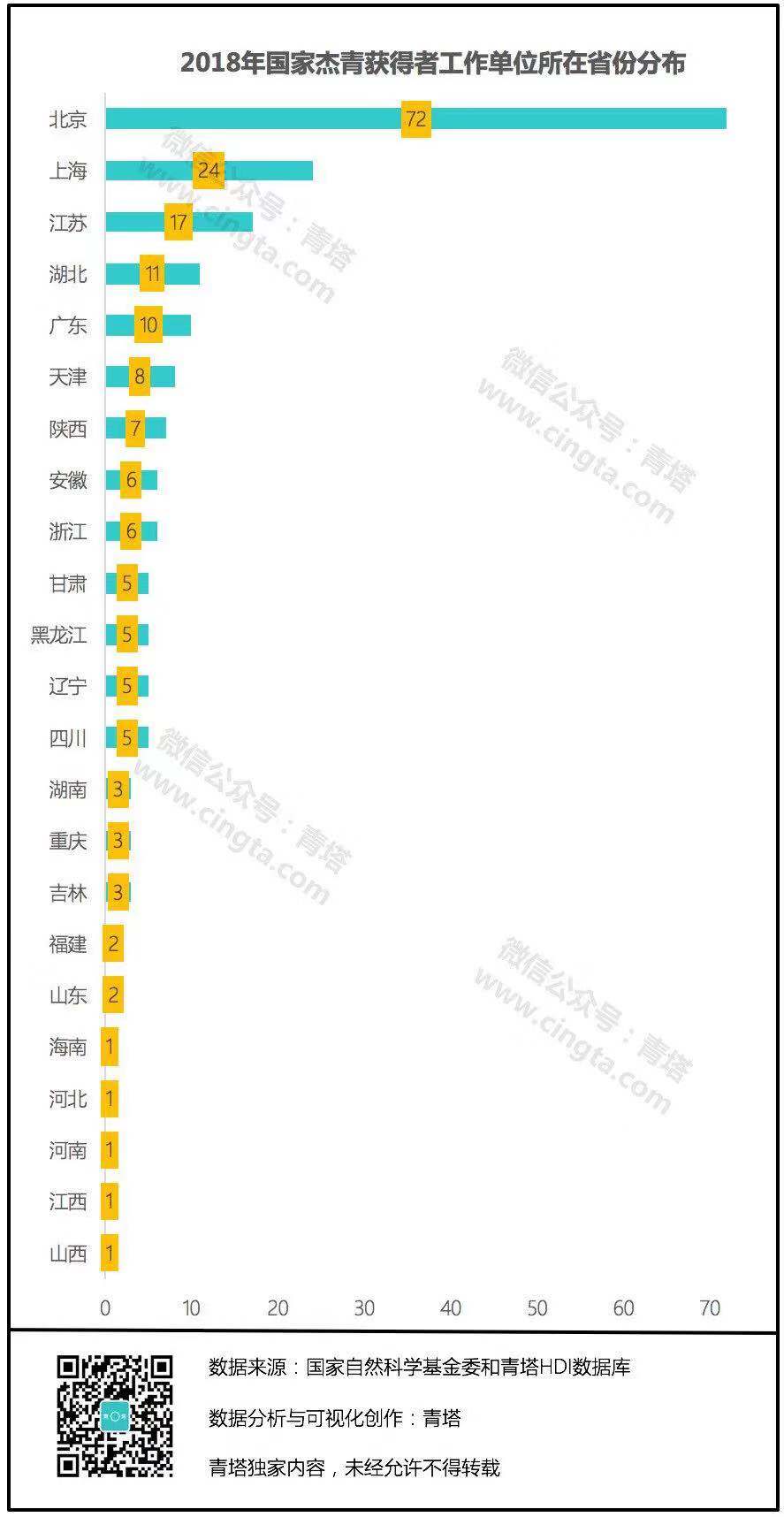 本文转载自“青塔”。 经过网络函评、会议答辩、网上公示和评审委员会评定等环节,共有199名学者入围2018年国家杰青获资助名单。与2018年杰青公示数据相比,有一人未能通过公示,来自天津某高校教师。 再有几个月,2019年国家自然科学基金项目的申报工作也即将启动。为提高项目申报成功率,参考往年的数据往往是很有必要的。今天青塔就对2018年国家杰青这一重量级项目进行盘点,从各维度进行统计,供有需要的老师参考。 资助人数 本年度共有199位国家杰青申请人正式入选资助名单,来自112家科研单位,包括各大名校以及中国科学院等。 资助率 国家自然科学基金委员会2018年度共接收国家杰青项目申请2974项,经初步审查受理2950项,建议资助200项,最终199项获批,资助率为6.7%。 学历 从学历来看,今年的199名杰青获得者无一例外全部具有博士学位。 性别 从性别来看,男性获得者占绝对优势,高达177名,而女性则只有22名。 专业技术职务 从专业技术职务来看,绝大多数拥有正高级专业技术职务。其中教授112位,研究员81位,副教授和副研究员各有1位,主任医师4位。今年杰青获得者中仅有的副教授和副研究员分别来自北京大学和中国科学院物理研究所。 省份分布 各省份中,北京毫无疑问领先其他省份,其入选国家杰青人数为72人,占全国比重达到36.2%,几乎等于从排名第五的广东到无人入选的广西等27省份之和。上海入选国家杰青也达到24人次,位居全国第二,占全国比重达到12%。江苏入选数位列全国第三,达到17次。湖北入选数为11人,位居第四位。广东共有10人入选,位居第五位。除了北京、上海、江苏、湖北和广东外,其余省份均少于10人。 需要注意的是,广西、贵州、内蒙古、宁夏、青海、西藏、新疆、云南等省份,无1人入选2018年国家杰青。