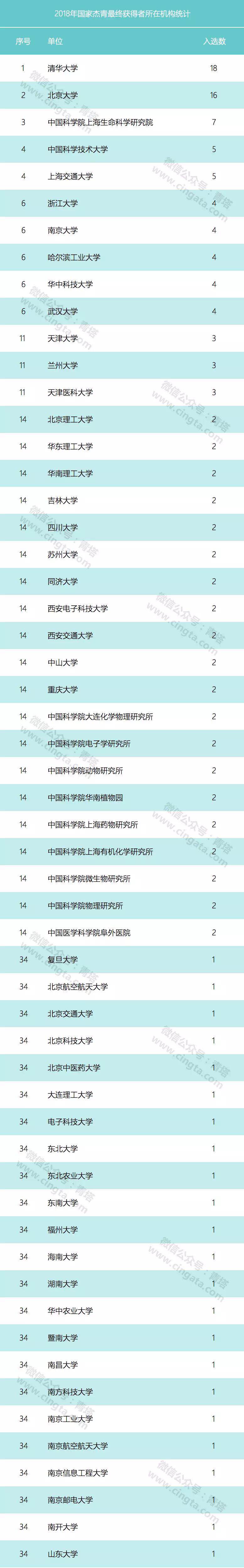 机构类型 经过统计,来自双一流高校(含附属医院)的杰青共有135人,占据绝大多数名额;中国科学院系统约56人(不含中国科学技术大学和中国科学院大学约50人),占比超1/4;非双一流高校共8人;其他科研机构和企业等单位共6人。 各单位入选数 清华大学入选人数最多,达到18人。北京大学入选16人,紧随其后,清华和北大两所学校入选杰青占比超过了17%,远远多于其他高校。中国科学院上海生命科学研究院入选7人,中国科学技术大学和上海交通大学各入选5人。浙江大学、南京大学、哈尔滨工业大学、华中科技大学、武汉大学各有4人入选。其他高校入选数和科研机构少于4人。