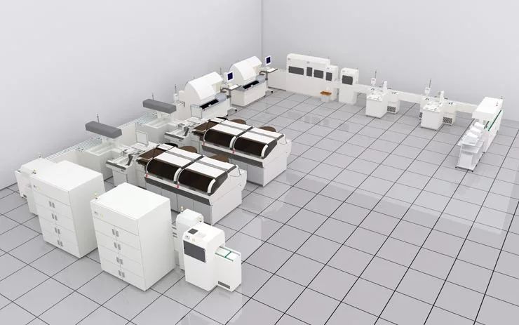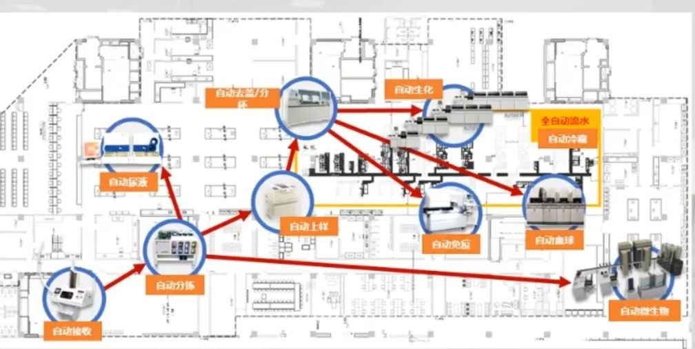 现在流程一般包括:自动接收,自动分拣(体液标本、尿液标本、血液标本),自动上样,自动去盖,自动免疫、自动生化,自动血球;微生物进入微生物流水线,尿液进入自动尿液流水线。如果是质谱做的非常好,流水线运行就流畅很多。