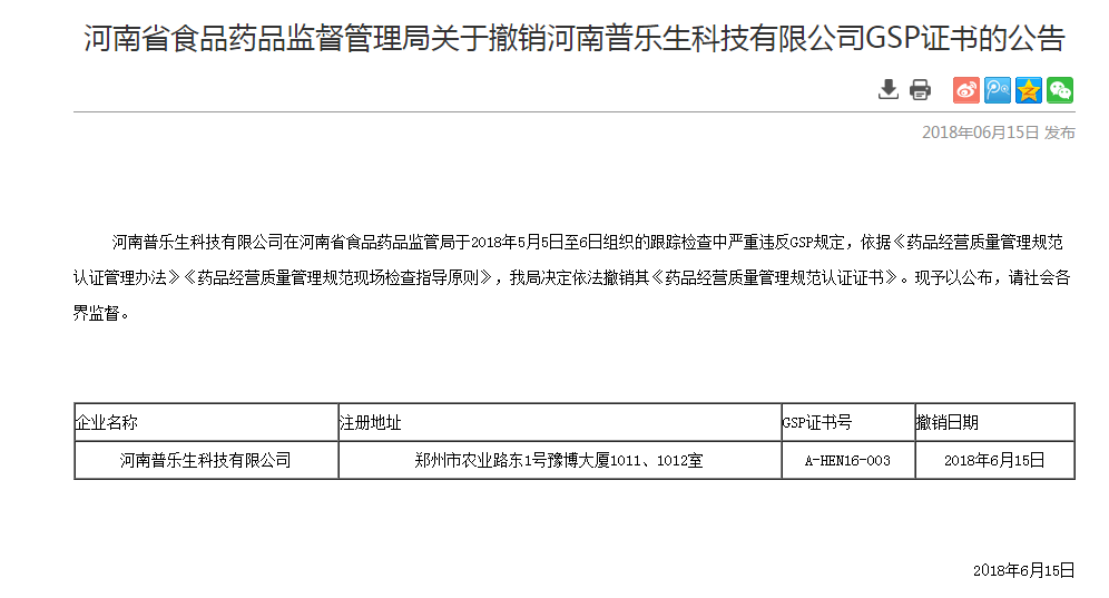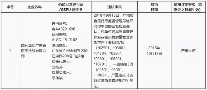 10月19日,广东省食药监局因对国药集团广东省医学检验有限公司进行飞检,查到存在缺陷,撤销了其GSP证书,信用评定等级为“严重失信”! 早至今年5月,河南普乐生科技有限公司在河南省食品药品监管局于2018年5月5日至6日组织的跟踪检查中严重违反GSP规定,决定依法撤销其《药品经营质量管理规范认证证书》。