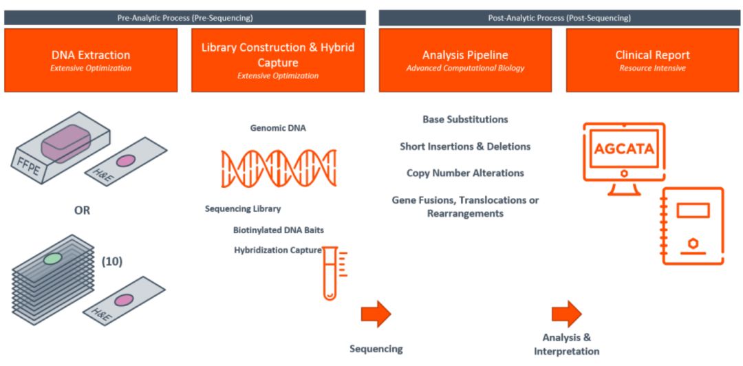 一个标志物要获批用于伴随诊断(CDx),必须对靶向治疗和免疫治疗的疗效具有非常好的预测价值,因此,任何一个用于检测这些标志物的新的检测手段需要经过严格的分析性和临床验证。基于NGS的全面基因组分析(CGP)平台FoundationOne CDx (F1CDx) ,在开发时就严格遵循FDA CDx适应症的规定。在2018年10月份召开的ESMO大会上,Foundation Medicine详实地公布了采用单基因伴随诊断检测方法,从临床和分析性验证两方面评估F1CDx平台。 方法 提取FFPE肿瘤组织的DNA,构建全基因组文库,采用Illumina HiSeq 4000平台进行测序。对324个测序基因数据进行分析,旨在发现碱基置换、插入或缺失、拷贝数变异、基因重排、微卫星不稳定性(MSI)和肿瘤突变负荷(TMB)。 图1. FoundationOne CDx(F1CDx)分析流程 结果 对F1CDx与单基因伴随诊断进行非劣效性验证,单基因伴随诊断包括EGFR cobas检测、BRAF突变检测、FISH和IHC检测ALK重排、FISH法检测ERBB2扩增和其他。评估两个检测方法的阳性一致性(PPA)和阴性一致性(NPA),总结见下表1。 表1. 对FDA获批的F1CDx采用单基因伴随诊断进行临床验证 备注:1. BRAF V600K和V600E二核苷酸检测的敏感性在cobas 检测中显著更低,尤其是在F1CDx可以检测MAF最低40%的二核苷酸变异时,因此导至两种检测方法之间NPA值较低。 2、F1CDx检测所有基因变异形式的分析敏感性(LoD) 下表2显示了F1CDx检测所有基因变异形式的分析敏感性(LoD)。 表2. F1CDx检测所有基因变异形式的分析敏感性(LoD) 3、F1CDx的分析精准性(不同检测方法和不同批试剂的可重复性) 表3. F1CDx的分析精准性 4、以TMB 10 mut/Mb作为cutoff值,F1CDx与全外显子测序的分析一致性 86例标本同时接受了F1CDx和全外显子检测,其中全外显子检测覆盖的编码外显子大小为34.7Mb。 表4. 以TMB 10 mut/Mb作为cutoff值,F1CDx与全外显子测序的分析一致性 图2. F1CDx TMB评分与全外显子测序TMB评分的分析一致性 5、接受F1CDx检测的肿瘤类型分类 接受F1CDx临床检测的患者,57%属于有CDx的肿瘤,其中NSCLC最常见,占24%,不同瘤种占比分布见下图3。不同瘤种患者中,拥有CDx变异的患者比例分布为:NSCLC(15.6%)、乳腺癌(9.2%)、结肠癌(53.6%)、黑色素瘤(19.3%)、卵巢癌(21.1%)。在结肠癌患者中,46.4%携带CDx变异的患者适合接受治疗。在乳腺癌患者中,CDx变异患者比例较低的原因可能是患者接受了FISH或IHC检测,因此未送检F1CDx检测。 图3. (a)接受F1CDx检测的肿瘤类型分类; (b)CDx阳性的患者数量 6、所有瘤种的常见变异基因 在所有瘤种的变异基因中,最常见的为TP53和CDKN2A变异,KRAS和APC变异在结直肠癌中更常见,见图4A;对MSI-H的24例患者进行单独分析,10例为结直肠癌,3例为子宫内膜癌。 图4. 所有瘤种的常见变异基因分布 7、TMB评分分布 大多数治疗中,TMB为3-4 mut/Mb,仅少数患者为高TMB,不同患者的TMB评分分布见下图5A;CDx阳性的不同瘤种患者的TMB评分分布见下图B。相比于CDx阳性的患者,仅在NSCLC患者中观察到CDx阴性患者的TMB显著更高。 图5. (a)所有患者中的TMB分布; (b) CDx阳性的不同瘤种患者的TMB评分 结论 Foundation Medicine研发了第一个基于NGS的全面伴随诊断检测平台——F1CDx,在实体瘤中进行了广泛的临床和分析性验证,并获得FDA批准用于伴随诊断。F1CDx平台目前已经在5个瘤种,8个伴随诊断适应症,包含17个靶向药物的伴随诊断方法中进行了临床验证。F1CDx在不同瘤种中的分析性平台已经建立。此外,研究还发现采用F1CDx检测和全外显子检测的TMB评分高度相关。最初验证的1338例临床患者覆盖不同的疾病类型,包含不同的CDx变异形式,以及MSI-H和TMB高的患者,这一研究证实F1CDx检测结果可以指导患者治疗。 专家点评 博士、博导 肺癌靶向治疗已经走过10余年历程,临床应用已经非常成熟了,随着越来越多治疗靶点的发现和靶向治疗药物的应用,我们已经走进精准肿瘤治疗时代。靶向治疗,顾名思义需要有精准的靶点,即携带某种基因变异的肿瘤患者才能接受这类治疗。目前获批的靶向治疗药物,在获得FDA批准上市时,通常都同时获批了相应的伴随诊断平台,如EGFR突变的Cobas检测、ALK重排的FISH分离探针等。但随着越来越多治疗靶点的发现以及靶向药物的应用,传统的单基因检测模式已经不能很好地满足临床需求,国内外指南均推荐应用多基因检测平台,同时覆盖多个已经获批的伴随诊断,从而实现高效检测。F1CDx是FDA和CMS批准的首个经过临床验证的NGS伴随诊断(CDx),这一平台在获批之前经过了严格的临床和分析性验证,证实了F1CDx平台的检测效能,可以作为临床多基因检测的首选之一。 Clinical and analytical validation of an FDA approved comprehensive genomic profiling (CGP) assay incorporating multiple companion diagnostics for targeted and immunotherapies. 2018 ESMO, 79P. |