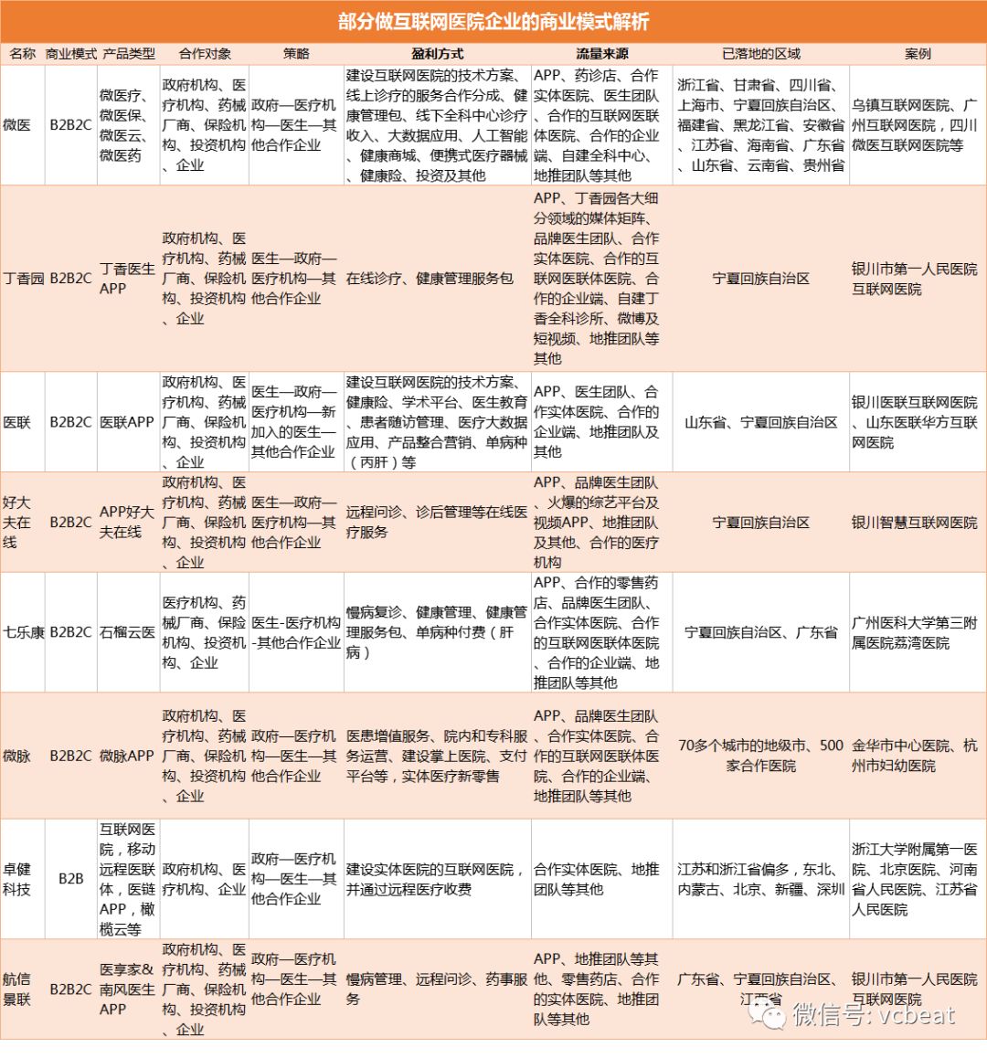 自从互联网医疗诞生以来,一直面临盈利的困境。随着2017年在银川集体爆发互联网医院,并迎来了关注的制高点,而备受瞩目。 随后因政策遇冷,在2018年被正名全面复苏,迎来行业新的的关键性节点:地方监管紧急完善,各方积极探索,百花齐放。 值此之际,互联网医院成为解救众多互联网医疗企业的扭亏为盈的砝码。那么它如何具有哪些盈利方式,流量从何而来? 为此,我们选取了目前部分做互联网医院的企业,从他们的发展情况和商业模式,总结关于互联网医院盈利的方式和流量来源。那么具体有哪些企业? 选取8家做互联网医院企业的商业模式解析 这次被选取的企业,他们具备这样的特征:有的是融资比较频繁;有的是落地互联网医院较多,实操经验丰富;有的是从医药电商转型跨界而来;有的是从医院信息化系统转型;有的是互联网医院处方量最多的……具体而言是微医、丁香园、医联、好大夫在线、七乐康、微脉、卓健科技、航信景联这8家企业。 那他们具体如何做的?如图所示: 1、商业模式以B2B2C为主 从选取的这8家企业看,他们的商业模式有7家是B2B2C,仅有1家是B2B。这和今年9月国家卫健委和国家中医药管理局联合发布了《互联网医院管理办法(试行)》、《互联网诊疗管理办法(试行)》、《远程医疗服务管理规范(试行)》等3个文件的通知有关。 旨在规范互联网诊疗活动,推动互联网医疗服务健康快速发展,保障医疗质量和医疗安全,根据《执业医师法》、《医疗机构管理条例》等法律法规,制定本办法。 其中提到互联网医院的准入条件:实体医疗机构自行或者与第三方机构合作搭建信息平台,使用在本机构和其他医疗机构注册的医师开展互联网诊疗活动的,应当申请样互联网医院作为第二名称。 但是实施互联网医院准入前,省级卫生健康行政部门应当建立省级互联网医疗服务监管平台,与互联网医院信息平台对接,实现实时监管。目前银川市的大数据监管平台已经上线,等同于文件中提到的“省级互联网医疗服务监管平台”,所以该地区的互联网医院的配套相对完善,吸引了众多企业去入驻。 其他地区的省级互联网医疗服务监管平台,也正在搭建和规划中,明年应该会落地不少这样的平台。 2、24种盈利方式:诊疗、慢病、远程、技术提供商 从盈利方式看,这8家企业主要依靠线上诊疗的服务合作分成、健康管理包、慢病复诊、药事服务、大数据应用、医生教育、患者随访管理、健康管理、远程问诊。 目前已经实现盈利的产品却是依靠单病种付费。以七乐康为例,根据石榴云医最近6个月的数据显示:肝胆科和男科已经成功实现盈利。 总部位于广州的石榴云医互联网医院前身是七乐康互联网医院,自2015年从医药电商转型互联网医院就坚持定位在慢病管理。主要通过线下地推的方式发展医生。这在当时以信息提供、用户挂号、轻问诊为主要商业模式的互联网医疗大环境下可以说完全是个异类。 经过三年的探索和坚持,七乐康互联网医院先后在广州、银川落地,发展至今已有数十万医生在平台认证,覆盖全国31个省超过300个城市慢病管理领域累积了丰富的资源。结合前身医药电商的优势,初步构建完成一个完整的“医、患、药、检、险”的闭环,也摸索出一套有效的打法和清晰盈利路径。 石榴云医互联网医院首席运营官焦宇介绍说:“医生天然有社交化的圈子,同学圈、科室圈、地区圈、会议圈、培训圈、学派圈……基于圈子再结合我们高度贴合的慢病复诊定位和既有的医、药、患、检、险资源,能帮助我们快速解决医生对平台和业务模式的认知问题。 所以从今年5月开始针对男科和肝胆科推出了“星连星计划”,利用独有的复合领域的矩阵连接结构率先尝试医生社群的运营。 “通过KOL种子医生发展社群医生,使用线上招募、社群裂变、线下地推配合的全新模式,取得显著效果。在肝胆科方面,我们通过社群运营对医生开单转化进行优化,最终在8月份实现了单科室盈利。在男科方面,我们仅用了4个多月的时间,就实现了全国60%+的男科医生在平台完成注册,6个月实现盈亏平衡。社群医生月均增长率高达68%,社群医生留存率高达99.7%。这一创新运营模式在乙肝科和男科的成果,使我们有信心在不久的将来成功复制到更多慢病科室。” 3、流量来源:APP、合作医院是主要渠道 从流量来看,这些企业的渠道主要有自家APP、药店、合作实体医院、医生团队、合作的互联网医联体医院、合作的企业端、自建诊所或全科中心、地推团队等其他。 获取这些渠道,自然也是企业的成本。此前,中电健康基金合伙人王晓岑曾介绍,搭建互联网医院的IT的成本不太高,沟通成本很高,跟医院谈判要取得一个对等的谈判地位,对企业自身的规模、创始人的过往的经历等要求都非常高。所以她并不建议初创企业做互联网医疗。虽然很多企业可以用很多形式去突破,但是这个产生的机会成本和时间成本是相当高,这都无法预计。 并不是每一家企业都能像丁香园那样拥有多个细分领域的媒体矩阵。同时凭借内容吸引流量很苦又需要时间的积淀。 在医疗领域里,B端流量较大是三甲医院、具有口碑的品牌医生、社区药店;在C端用户较多的是新型的短视频平台和微博、综艺节目等。 所以,企业根据自己的发展模式和具体的阶段,是需要不同的流量渠道的。如果商业模式成熟,需要拓展C端