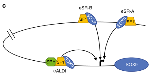 性别逆转的小鼠。Credit: Greta Keenan, Francis Crick Institute. 在携带XY染色体的小鼠中,将调控SOX9表达的增强子Enh13删除后,小鼠就会长出卵巢而不是睾丸。这表明,仅Enh13这一增强子就能控制像性别这样重要的事情。 这一发现引起了科学界的高度关注,被认为是一项突破性的成果。 之所以这项成果会获得如此高的评价有两大原因: 第一,它证明了决定性别的“关键开关”位于DNA中的非编码区,该区域也被称为“垃圾DNA”。 第二,这项在小鼠中开展的研究对人类研究具有非常明确的指导意义。几十年来,科学家们一直在寻找导至性发育障碍(DSDs)的基因,但这项成果表明,性发育障碍的病因可能藏在“垃圾DNA”而不是基因中。 半年后,研究成果在人类中“被复制” 那么,人类中的性发育障碍(DSDs)是否也与增强子这种开关有关呢? 在Francis Crick研究所的成果发表后,Hudson医学研究所的分子遗传学家Vincent Harley表示,他的团队已经开始调查自己患者的基因组,看看他们无法解释的性别问题是否能够追踪到这类“开关”上。 半年后,相关成果正式发表,也就是这篇最新的Nature Communications论文。 研究中,经生物信息学分析,科学家们确定了人类SOX9基因的三个增强子:eSR-A、eSR-B、eALDI。