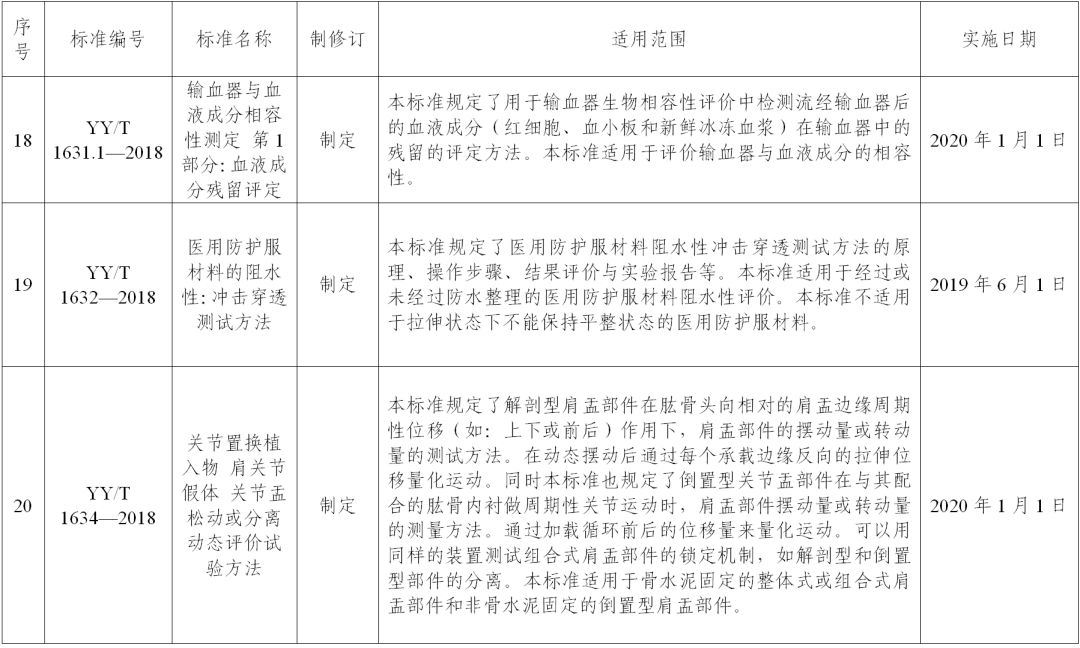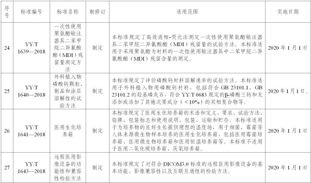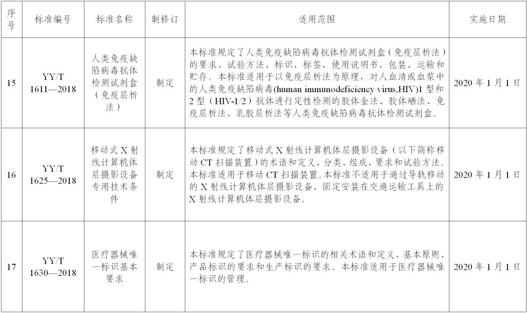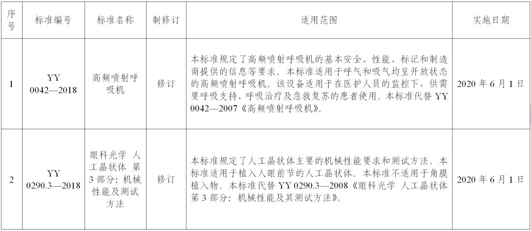 关于批准发布YY 0042—2018《高频喷射呼吸机》等27项医疗器械行业标准的公告 (2018年第97号) YY 0042—2018《高频喷射呼吸机》等27项医疗器械行业标准已经审定通过,现予以公布,其中,强制性标准4项,推荐性标准23项。标准编号、名称、适用范围和实施日期见附件。