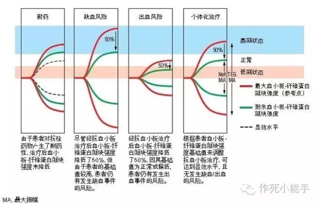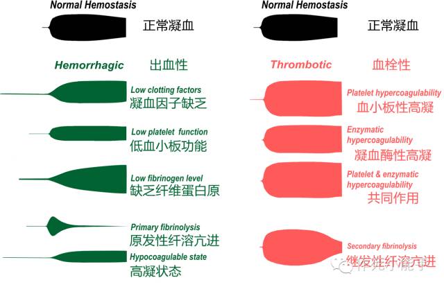 血栓弹力图(thromboela-stogram,TEG)是反映血液凝固动态变化(包括纤维蛋白的形成速度,溶解状态和凝状的坚固性,弹力度)的指标。 影响血栓弹力图的因素主要有:红细胞的聚集状态、红细胞的刚性、血凝的速度,纤维蛋白溶解系统活性的高低等。 血液凝固过程和常规凝血检查的对应关系 血栓弹力图的原理 如图,...(省略一百字),根据钢丝/探针的振幅绘制出描记图,这个图的轮廓就是血栓弹力图。 血栓弹力图(thrombelastogram,TEG)是血栓弹力仪描绘出的特殊图形。弹力仪的主要部件:自动调节恒温(37℃)的不锈钢盛血杯,插入杯中的不锈钢的小圆柱体及可连接圆柱体的传感器。盛血杯安置在能以4°45'角度来回转动的反应池上,杯壁与圆柱体中间容放血液。 当血液标本呈液态时,杯的来回转动不能带动圆柱体,通过传感器反映到描图纸上的信号是一条直线,当血液开始凝固时,杯与圆柱体之间因纤维蛋白黏附性而产生阻力,杯的转动带动圆柱体同时运动,随着纤维蛋白的增加阻力也不断增大,杯带动圆柱体的运动也随之变化,此信号通过传感器描绘到描图纸上形成特有的血栓弹力图。 本 底 ↓如果人为将凝血过程分为几个阶段,相对应的TEG是酱婶儿的: 需要关注的参数就是中间最惹眼的几个圆圈圈。知道这几个参数是啥意思,就基本能看懂本底图。 R=反应时间,代表凝血因子激活到形成纤维蛋白所需的时间,所以评价的是凝血因子的功能。这条线长说明凝血因子缺乏,反之同理。 K时间和α角:血凝块形成的速率。这个阶段纤维蛋白和血小板都有参与,但此时主要反应纤维蛋白的功能。当极度低凝状态时,K时间是测不出来的,这时看α角更靠谱些。角度越大,上图开口越大,血块形成越快。 MA值:这里同样纤维蛋白(20%)和血小板(80%)都有参与,但主要反应的是血小板的聚集功能。基线MA的高低对抗栓药抑制率有不同的要求,基线MA越高,抑制率也需要提高。 LY30和EPL:反应纤溶活性。评价有无DIC时需要看这里。 不同TEG图形的例子 肝素对比检测 这个比较好理解,一组加肝素酶(去除肝素对血样的影响),一组不加,然后比较两组的R时间,如果差不多说明体内没有肝素影响,或者用了肝素还没起效;如果不加肝素酶组R时间明显延长,说明体内的肝素影响了凝血过程。 血小板抑制率 开口最大的(黑线)是基线水平,开口最小的(红线)是纤维蛋白的功能,所以黑线-红线是体内血小板的实际功能。蓝线代表服用抗栓药后血凝块强度,抑制率计算公式见上图。AA代表阿司匹林,ADP代表氯吡格雷或替格瑞洛。另外如果是替罗非班则可以把图形变为近似一条直线。具体药理机制可回复"抗栓"。 一般抑制率小于30%认为没起效;AA>50%、ADP>30%开始起效;50-70%达标;70%以上较强。如上文所述,抑制率需根据本底MA值个体化调整。 临床意义 (1)血栓性疾病:肾病综合征、尿毒症、冠状动脉粥样硬化性心脏病(冠心病)、心绞痛、心肌梗死、脑梗死(脑梗塞)、动静脉血栓形成等,r值及k值明显减少,而ma值及mε值增大。 (2)血小板异常性疾病:原发性和继发性血小板减少症,r和k值增大,而ma值和mε值值降低。血小板功能异常性疾病则ma值和mε值明显降低。 (3)凝血因子缺陷性疾病:血友病类出血性疾病,r值及k值显著增加,而ma值及mε值降低。 (4)纤溶亢进性疾病:原发性纤溶症、播散性血管内凝血(弥散性血管内凝血)的继发性纤溶,在突发纤溶时,TEG可示纤溶的强度和速度。 TEG血栓弹力图试验的适应症 1. 术前术后各种凝血异常的筛查。 2. 术前评估凝血全貌,判断出血风险。 3. 各种出血原因的鉴别诊断、指导成分输血。 4. 输血前原因判断,输血后效果评估。 5. 诊断手术期凝血功能紊乱,指导输血和用药。 6. 鉴别诊断原发性纤维蛋白溶解亢进和继发性纤维蛋白原溶解亢进。 7. 监测各种促凝、抗纤或抗凝等药物的疗效,如华法令、比伐卢定、 诺其、戊糖、止血环酸等,指导正确使用。 8. 高凝状态诊断,评估血栓发生几率。 9. 使用各类抗血小板药物患者疗效判断,鉴别出血、再缺血原因,术前出血风险评估。 10.各种使用肝素的手术或治疗中,如CPB(体外循环)、器官移植、肾透、血透、各类介入、PCI等,药物效果、凝血状况及鱼精蛋白中和效果的评估。 11.使用低分子肝素抗栓治疗的疗效判断。 12.各类手术尤其是PCI(经皮冠状动脉介入治疗)、介入、骨科、妇科、器官移植、CABG(冠脉搭桥术)、ECMO(体外膜肺氧合)、血管外科等术后的血栓发生的评估。 13.监测凝血因子不足。 14.血小板功能检测。 15.血友病的治疗。 16.急性创伤、烧伤、休克患者的凝血功能评估。 17.各种溶栓治疗如尿激酶、链激酶、tPA(组织纤溶酶原激活剂)等监测。 18. 高血栓风险患者的体检。 来源:作死小能手微信号及基层检验网 |