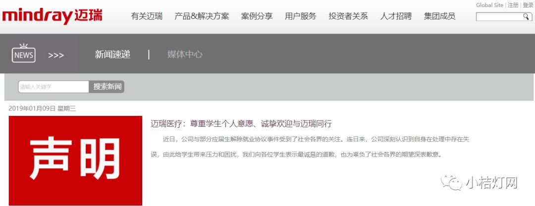 2019年1月9日,迈瑞官方发布声明称经过公司内部进行多次深入研究与谈论,将保持就业协议的有效性,欢迎各位应届毕业生按照原计划到迈瑞就业报道。