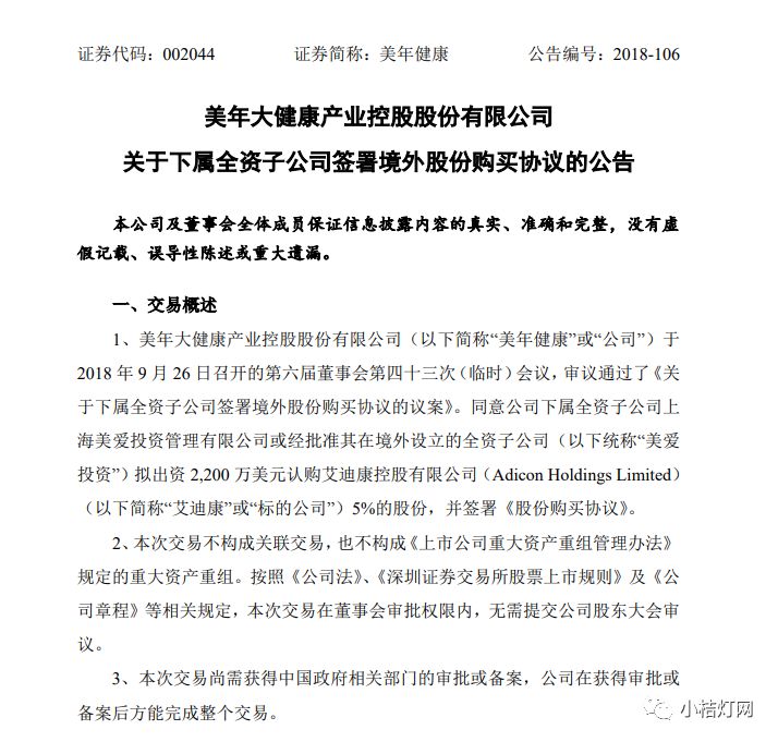 2018年9月27日,美年健康发布关于下属全资子公司签署境外股份购买协议的公告。宣布批准其下属子公司海美爱投资管理出资2200万美元认购艾迪康控股有限公司5%的股份。美年大健康产业(集团)有限公司是中国最大的体检及健康服务集团。杭州艾迪康是全国跨地区连锁经营的第三方独立医学检验机构,其主要业务模式为在中国境内提供医学检验服务,检测服务包括病理学、遗传学、生物化学、免疫学、分子诊断学、微生物学、微量元素和药物临床试验的检验检测。与金域检验、迪安诊断和达安基因合计约占半数以上的第三方医学检验市场份额。艾迪康的市场份额为17%,综合实力处于行业老三。