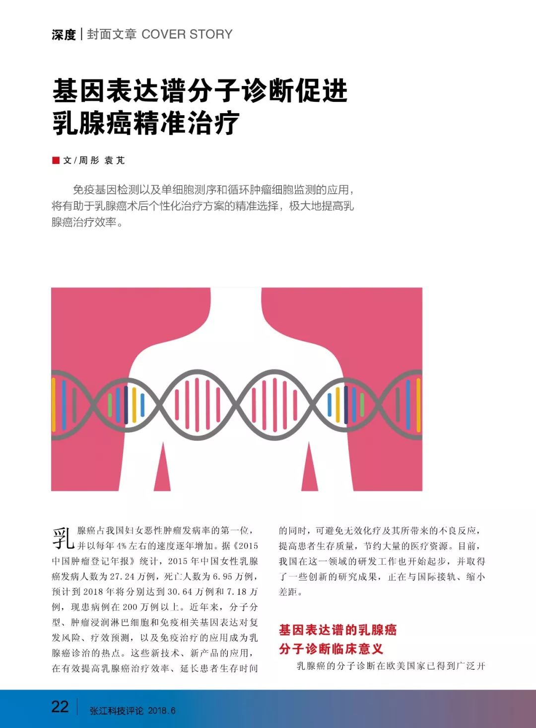 导读:免疫基因检测以及单细胞测序和循环肿瘤细胞监测的应用,将有助于乳腺癌术后个性化治疗方案的精准选择,极大地提高乳腺癌治疗效率。 作者介绍: 周彤,上海市预防医学研究院研究员,美国华人生物医药科技协会北卡分会理事长(CBA-NC),善准生物科技有限公司首席科学家。 袁芃,国家癌症中心/国家肿瘤临床医院研究中心/中国医学科学院北京协和医学院肿瘤医院特需医疗部教授 、博士生导师 。 本篇文章刊发于《张江科技评论》第六期,后续我们会继续连载《张江科技评论》刊发的癌症领域的相关内容,大咖谈癌症,敬请期待! |