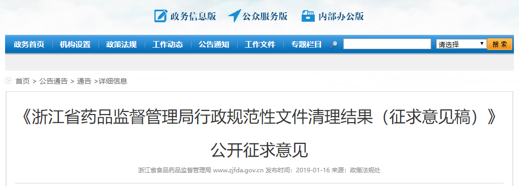 根据《浙江省行政规范性文件管理办法》的规定,省药品监督管理局对2018年10月31日之前印发实施的涉及药监职责的行政规范性文件进行全面清理。现将《浙江省药品监督管理局行政规范性文件清理结果(征求意见稿)》公开发布,征求社会各界意见,如有修改意见和建议,请于2019年1月24日前,以邮件或传真的方式予以反馈。 联系人:政策法规处 阮颖潇 电话:88903366 传真:88903271 电子邮箱:zjsplf@163.com 附件:《浙江省药品监督管理局行政规范性文件清理结果(征求意见稿)》