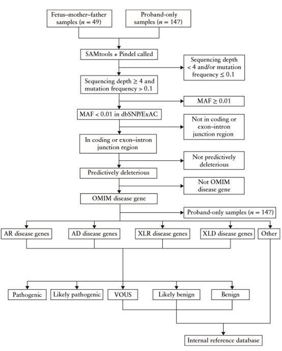 讨论 本研究是目前样本量最大的通过核型,CMA和WES分析结构畸形胎儿遗传因素的研究之一。核型阳性率为18.2%,略低于其他文献报告,芯片阳性率为8.2%,略高于样本量最大的研究得出的结果6%。全外显子的阳性率为24%(47/196),远高于核型(18.2%)与芯片(8.2%)。Trio比单人模式获得更高的阳性率,得益于可以分析新发突变和复合杂合突变。 总结,该研究表明WES是一种有前景的方法,在核型分析和CMA上产生阴性结果后,可用于鉴定导至胎儿结构异常的遗传变异。这种提高的诊断率有可能改善妊娠的临床管理,并更好地为受影响家庭的生殖决策提供信息。然而,由于产前时间要求紧和不完整的表型信息的限制,胎儿WES数据的解释可能具有挑战性。
