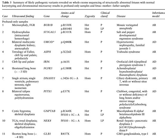 CMA分析 1680例胎儿CMA检测成功,包括396例为多系统异常组、1284例为单系统异常组。在138例发现临床相关CNV,阳性率为8.2%(138/1680)。在这些阳性中,多系统异常组阳性率为12.6%(50/396),单系统异常阳性率为6.9%(88/1284)。22q11.21缺失为最常见的CNV占到12.3%(17/138).随后是1p36.33-p36.22缺失和17q12缺失。 详细结果如下 全外显子分析 196例核型与芯片结果正常的胎儿以及49对父母进行了全外显子测序,值得一提的是,所有接受WES的胎儿病例都与结构异常有关,包括中枢神经系统畸形,心血管系统,骨骼系统,消化系统和泌尿系统以及颅面畸形和多发畸形,但不包括颈部半透明厚度≥3.5mm,囊性水肿和其他超声软标记物。结果见上面的table 2,平均测序深度为102X,99.56%的目标区域大于10X。之前已知用高分辨率芯片对样本进行检测,所以未对WES进行CNV分析。59名胎儿检测到阳性变异,阳性率达到30.1%(59/96)。但是12个变异不能解释临床表型,因为被归类为意外发现,因此能够解释患者表型的致病位点阳性率为24%(47/196)。部分结果如下表 Trio阳性率为26.5%,先证者单人模式阳性率为23.1%,多系统异常的阳性率最高为30.8%,需要注意的是78.9%(75/95)的阳性都是新发突变导至的。