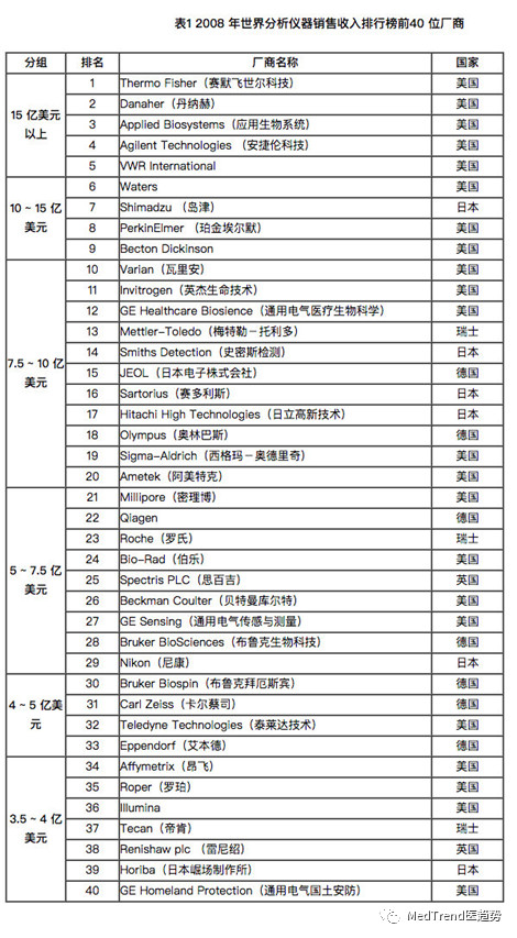 去年芯片被欧美限制的事情让很多朋友关心产业,并形成了一定的危机意识。除了半导体设备,还有哪些领域我们仍然受制于人,而且是严重受制于人? 仪器行业就是一个严重受制的行业。 参考2008年分析仪器行业的国际排名,数字来自国际战略方向公司出版的权威刊物《仪器市场展望》。Top40的名单中,尚无一家中国企业: