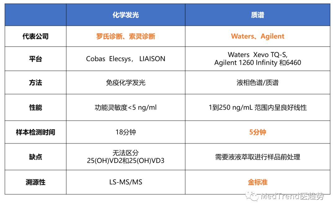 ▲世界分析仪器销售排行Top40(数据来源:国际战略方向公司、上海科技情报研究) 再看近期的数据,2017年知名杂志C&EN公布了全球仪器公司的名单,排在前几名的还是那么几家,安捷伦、丹纳赫、岛津等,仍然没有中国企业。 或许统计口径和数据标准有所区别,但在这个数据中也是可以直观的看出结论:经历十年发展之后,中国在仪器领域还是没有领先企业,发达国家仍然具有绝对控制力。 ▲2017全球仪器公司top20(数据来源:C&EN) 从这两份排行榜,我们也能切身感受到,外资IVD巨头如罗氏、丹纳赫、珀金埃尔默、Illumina、日立高新等,在仪器行业同样占据了一定的地位。 中国的IVD企业如果想赶上乃至于超越外资IVD,在仪器发展上面需要再加把劲,撸起袖子干。 临床质谱技术,为IVD带来新的曙光 当下,仪器行业对于IVD的渗透仍然在持续。最有望实现临床应用的便是临床质谱技术。 LC-MS/MS 相比于传统免疫方法,更加准确可靠,特异性和灵敏度更高。复旦大学附属中山医院已经采用Waters质谱平台开展: 1)甲氧基肾上腺素、甲氧基去甲肾上腺素、3-甲氧酪胺检测有助于诊断嗜铬细胞瘤; 2)肾上腺皮质激素20项有助于诊断多做内分泌疾病; 3)伊马替尼、卡马西平、苯妥英钠等9项治疗药物监测。 LC-MS/MS 高灵敏、高特异、靶向得到精确定量结果,快速、高通量、多组分分析助力临床精准医疗。 以维生素D检测为例,比较一下临床质谱方法与传统免疫方法。