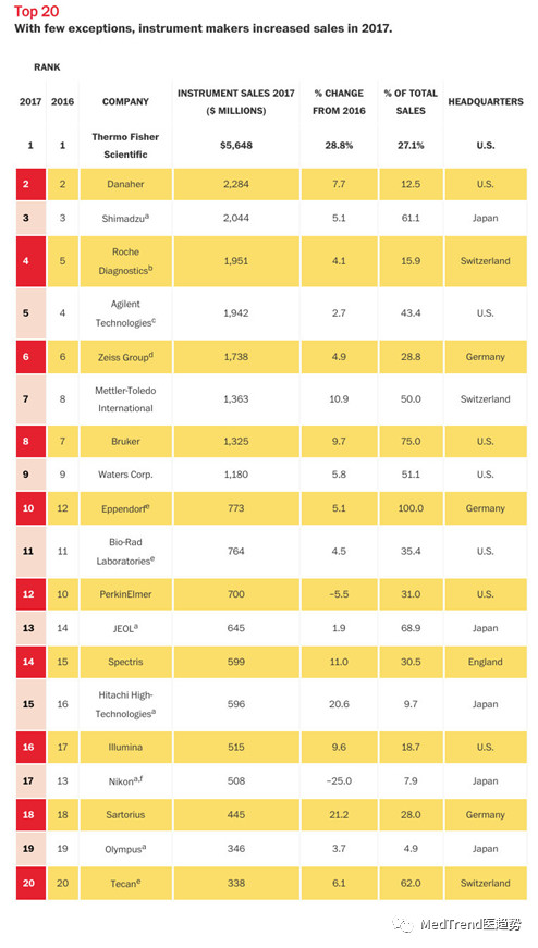 2018年,对于医药来说,最大的变化莫过于4+7带量采购引发的“降价”冲击。带量采购成功把原研厂家挤了出去,把国产仿制药的价格又一次压低,药品作为医药行业占比最大的板块,已经降到了地板价。 医疗器械的日子也不好过。IVD作为医疗器械最大的子版块,过去两年中,在多个省市都遭遇了“降价采购”、“两票制”、“挂网最低价”等招投标降价压力。大幅降价,不可避免地压缩了行业利润率。前路漫漫,IVD人该何去何从? 纵观IVD发展历程,IVD的每一次革新,背后都有仪器行业的突破。当下,仪器行业对于IVD的渗透仍在持续,最有望实现临床应用的便是临床质谱技术。而越来越多的临床质谱产品获批上市,又为广大IVD人带来了广阔机遇。 仪器行业的突破,推动 IVD变革 让我们回归初心,重新审视IVD的行业特点。 在2015年火热的创业氛围中,IVD领域可谓是风生水起,诞生了很多创新公司和产品,背后的原因何在? IVD的产品可以初步分为仪器、试剂、软件三大类。从运行上看,IVD可以划分为检测效率和临床价值。 这就使得各创业者很容易切入某个细分领域做精做好。提升检测效率和挖掘临床价值,就是IVD行业永恒的追求。在降价的大背景下,提升检测效率,其重要性将会超越临床价值。 说到检测效率,IVD在医院对应的科室——检验科和病理科,可谓是医院里最接近工厂的布局,各种大型检测设备、操作人员、流水线充斥其中。标本一旦离开人体,就开始在各种仪器之间按照固定模式进行检测,最终获得检测结果。其过程十分类似于工厂中,物料在各个机器之间来回穿梭,最终获得成品。从这个角度来观察,仪器的性能可以说是IVD产品最重要的一环。 国内各IVD公司,做试剂,做软件,看起来生意红红火火,但是仪器做得好的没有几家。不少试剂公司还需要借助进口仪器的平台才能实现最优化的检测,例如九强试剂与罗氏生化仪器的联姻,透景试剂与雅培免疫仪器的联姻。 为什么仪器会这么难? 2018年的中美贸易战,让大家都明白了芯片的重要性。仪器仪表和芯片的状况差不多,长期依赖进口。仪器不仅是IVD的基石,从更大维度来看,它是先进制造业比拼的必争之地,某种程度上,仪器行业是先进制造的 “创新之基” 。 综上来看,IVD人关注一下仪器行业发展,无论是对于自身职业生涯,还是提升国家民族先进制造业的能力,都大有益处。 如果我们把视线从IVD抬高到仪器行业,就会发现,IVD只不过是医疗领域,具有临床价值的一部分——蛋白质、核酸、脂类、糖类、无机盐的有效检测,在这个领域之外,还存在着环境监测、动植物检验检疫、质量检测、危险化学品检测、兴奋剂检测等。 在IVD行业内,有些问题看起来无解,但是站在更高的仪器角度,却能发现解决之道。 仪器行业Top20,仍无中国企业 可以这么说,IVD的每一次革新,背后都有仪器行业的突破。 以大家熟知的化学发光为例,目前的行业第一罗氏诊断成为化学发光的行业霸主,还经历了一段曲折。