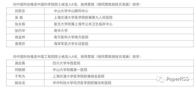 2月15日,中华医学会在其官方网站公示了2019年推选院士候选人的名单,包括向中国科协推选中国科学院院士候选人6名、中国工程院院士候选人4名。具体如下: 院士作为我国设立的最高学术称号,是一种终身荣誉。我国有中国科学院和中国工程院,中国科学院学部成立于1955年,是国家在科学技术方面的最高咨询机构,最初科学院院士被称为学部委员,1993年10月,经国务院批准,中国科学院学部委员改称中国科学院院士。 附:院士候选人介绍 刘奕志 二级教授,一级主任医师,博士研究生导师。国务院政府特殊津贴专家,中央保健会诊专家。中山大学中山眼科中心主任、眼科医院院长,白内障科学科带头人。亚太眼科学会常务理事,中华医学会眼科分会副主任委员,广东省医学会眼科分会主任委员。 从事眼科医疗、教学、科研及防盲工作30余年,是国内最早开展白内障超声乳化联合人工晶体植入术的专家之一,为国内外白内障患者施术近20万例。 吴皓 教授,博士生导师,上海交通大学医学院附属第九人民医院院长、上海交通大学医学院耳科学研究所所长、上海交通大学医学院耳鼻喉科学系系主任、上海市耳鼻咽喉科临床质量控制中心主任、上海市儿童听力障碍诊治中心主任。 张永振 中国疾病预防控制中心传染病预防控制所人兽共患病室主任、中国CDC传染病所研究员、复旦大学附属上海市公共卫生临床中心兼职教授。 张灼华 分子病理博士 ,现任南华大学校长,主要从事中枢神经系统的分子与细胞生物学和神经退行性疾病的分子病理机制研究。 侯金林 南方医院感染内科主任、主任医师、博士生导师。曾2次在英国伦敦大学医学院学习和工作。现担任中华医学会全国感染性疾病学会副主任委员、亚太地区肝病学会执行委员。广东省传染病和寄生虫病学会主任委员,广东省名医工程首批成员、珠江学者。 谢渭芬 医学博士,长征医院消化内科主任,内镜中心主任,教授、主任医师、博士生导师。从事消化系病临床、教学和科研工作30年。近年来先后主持国家杰出青年科学基金、国家自然科学基金重点项目、卫生部重大疾病专项基金等10余项基金,以通讯作者发表SCI论文近50篇,其中影响因子10分以上8篇。主编《临床肝脏病学》等专著5部,参编专著近30部。 龚启勇 华西医院副院长、放射科主任医师。2014年获聘长江学者特聘教授;2015年获国家自然科学奖二等奖;2016年当选国际医学磁共振学会ISMRM Fellow、并成为国家自然科学基金委创新群体带头人;2017年当选国际华人医学磁共振学会(OCSMRM)候任主席。 何晓顺 二级教授、博士生导师,中山大学附属第一医院副院长,中央保健专家。中国人体器官捐献与移植委员会委员,中国OPO联盟副主席、华南区主席,中华医学会外科学分会器官移植学组副组长,卫生部移植技术工程中心学术委员会副主任委员,广东省器官捐献与移植免疫重点实验室主任。获得国家科技进步二等奖1项,省部级科技进步一等奖5项、二等奖1项。发表学术论文330篇, SCI收录论文53篇。 于布为 现任上海交通大学医学院附属瑞金医院卢湾分院院长,瑞金医院麻醉科主任,瑞金北院麻醉科主任。担任中国医师协会麻醉学分会候任会长,中华医学会麻醉学分会常委,上海市麻醉科住院医师规范化培训及专科医师培训专家组组长。 姚尚龙 主任医师、教授、博士生导师。华中科技大学同济医学院麻醉与危重病医学研究所所长、同济医学院附属协和医院麻醉与危重病学教研室主任、麻醉科主任;获卫生部有突出贡献专家,享受国务院特殊津贴,湖北省第一层次优秀领军人才。 (来源:青塔 中华医学会、医学界) |