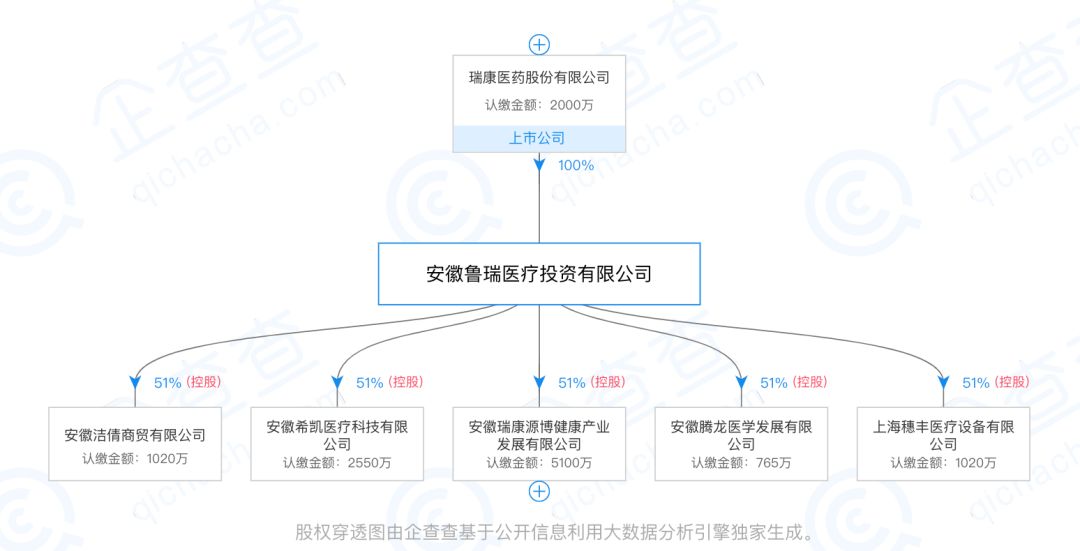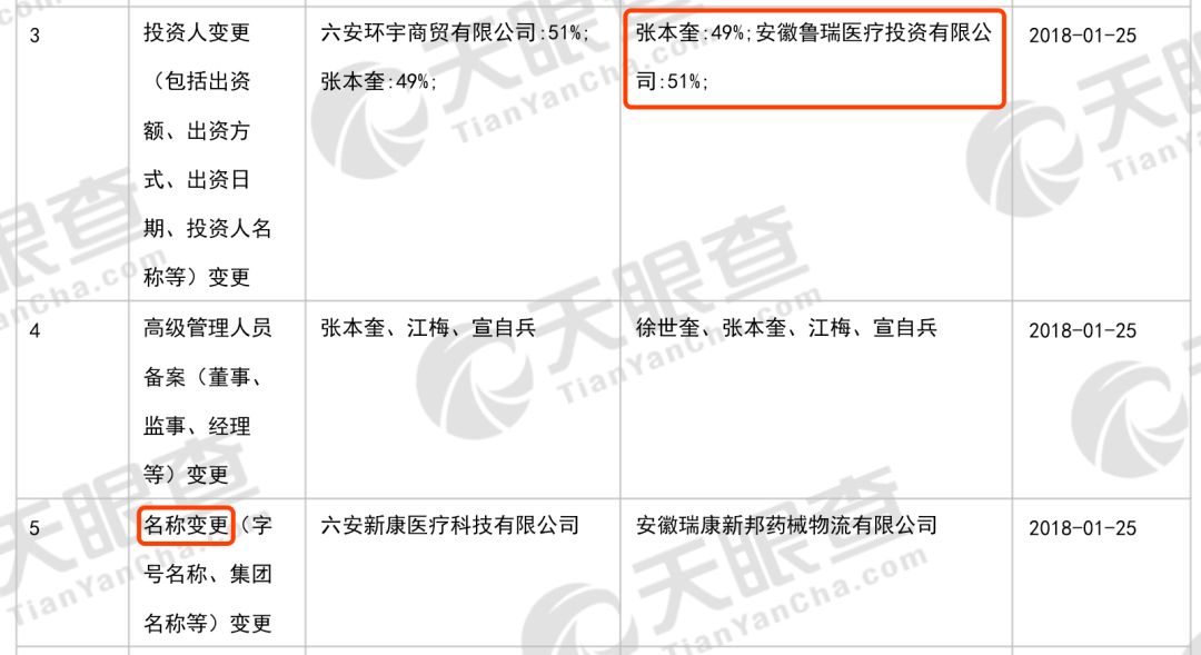 另外,工商关系显示,阜阳市人民医院招标项目的中标企业--安徽瑞康新邦在2018年初经过一系列工商关系变更,成为了瑞康医药的控股子公司。 根据天眼查数据,安徽瑞康新邦此前名为“六安新康医疗科技有限公司”,2018年1月25日经工商名称变更。 同时进行变更的还有“投资人变更”。 天眼查数据显示,2018年1月25日,安徽瑞康新邦的投资人股权关系由变更为:“张本奎:49%;安徽鲁瑞医疗投资有限公司:51%。 根据“企查查”提供的“股权穿透图”,安徽鲁瑞医疗投资有限公司由上市公司瑞康医药股份有限公司100%控股,认缴金额2000万。 内容源: 阜阳市人民医院官网 《淮北市人民医院医用耗材带量采购项目招标公告》 《阜阳市人民医院基础耗材、消耗耗材及基础器械一体化配送及服务商招标项目中标公告》 《阜阳市人民医院基础耗材、消耗耗材及基础器械一体化配送及服务商招标项目》 |