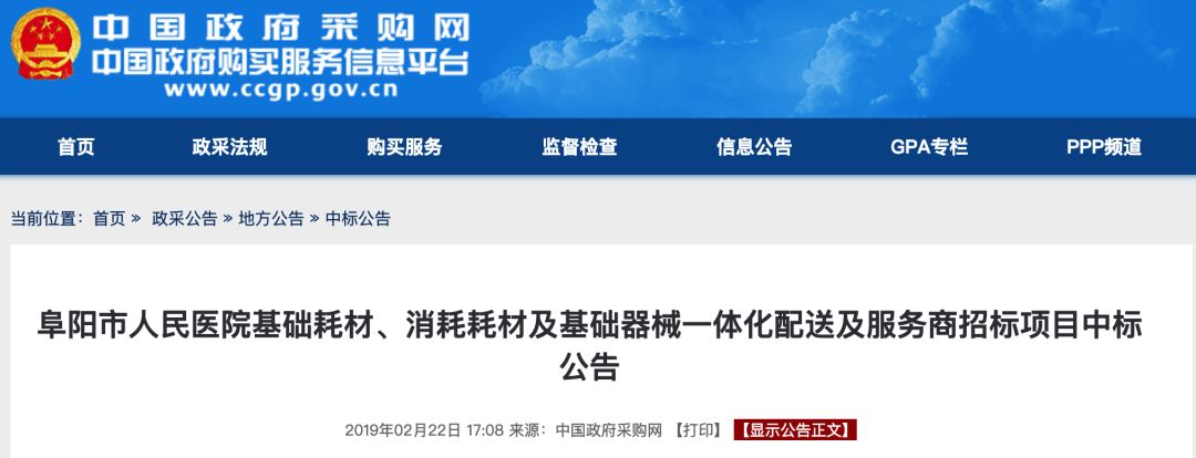 今天(2月22日),中国政府采购网发布《阜阳市人民医院基础耗材、消耗耗材及基础器械一体化配送及服务商招标项目中标公告》(下称《中标公告》),总中标金额约17633万元的耗材等配送及服务项目有了结果。 《中标公告》显示,安徽瑞康新邦药械物流有限公司(以下简称“安徽瑞康新邦”)在招投标评标中综合得分97.86分,成唯一中标企业。 图源:阜阳市人民医院基础耗材、消耗耗材及基础器械一体化配送及服务商招标项目中标公告