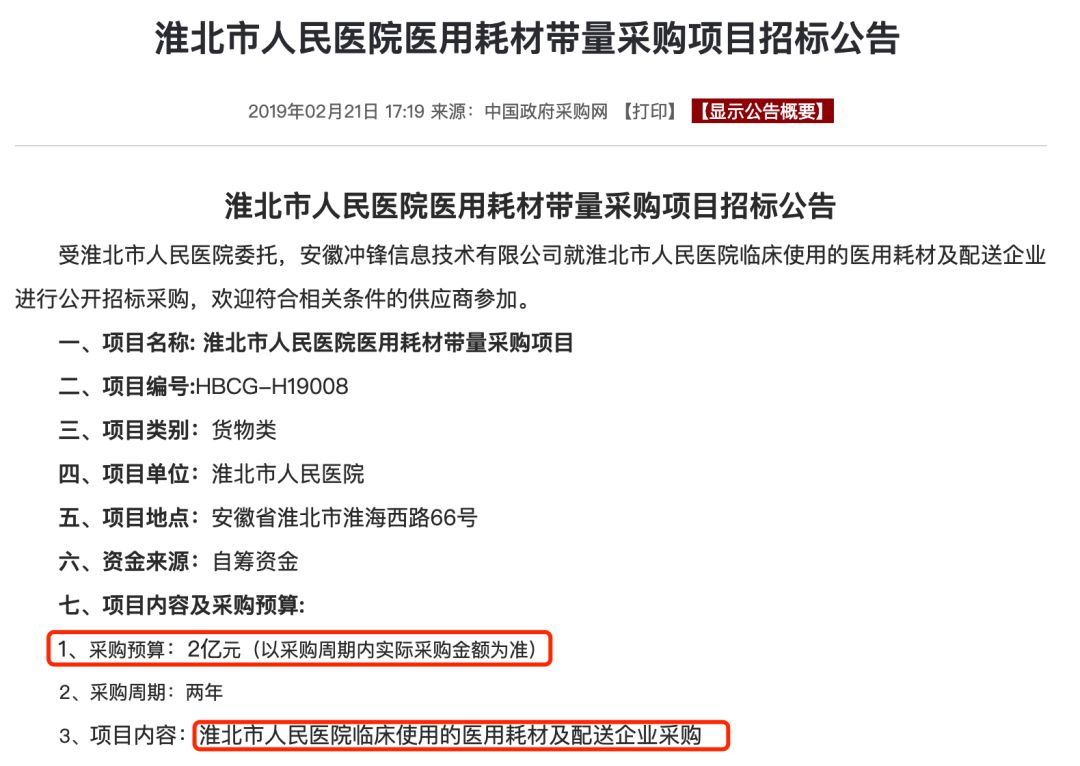 赛柏蓝器械注意到,阜阳市人民医院在项目招标里并没有直接要求“严格执行两票制”等条件; 而同为安徽省三甲医院的淮北市人民医院,在其2019年1月18日发布的2亿元医用耗材带量采购中标公告里则明确要求投标企业严格执行《安徽省公立医疗机构医用耗材采购“两票制”实施意见(试行)》。