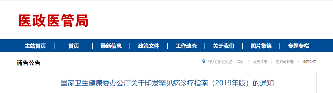 国家卫生健康委办公厅关于印发罕见病诊疗指南(2019年版)的通知 国卫办医函〔2019〕198号 各省、自治区、直辖市及新疆生产建设兵团卫生健康委(卫生计生委): 为提高我国罕见病规范化诊疗水平,保障医疗质量和医疗安全,维护罕见病患者健康权益,根据我委等5部门印发的《第一批罕见病目录》,我委组织国家卫生健康委罕见病诊疗与保障专家委员会办公室(中国医学科学院北京协和医院)牵头制定了《罕见病诊疗指南(2019年版)》(可在国家卫生健康委网站“医政医管”栏目下载)。现印发给你们,供各地参考使用。