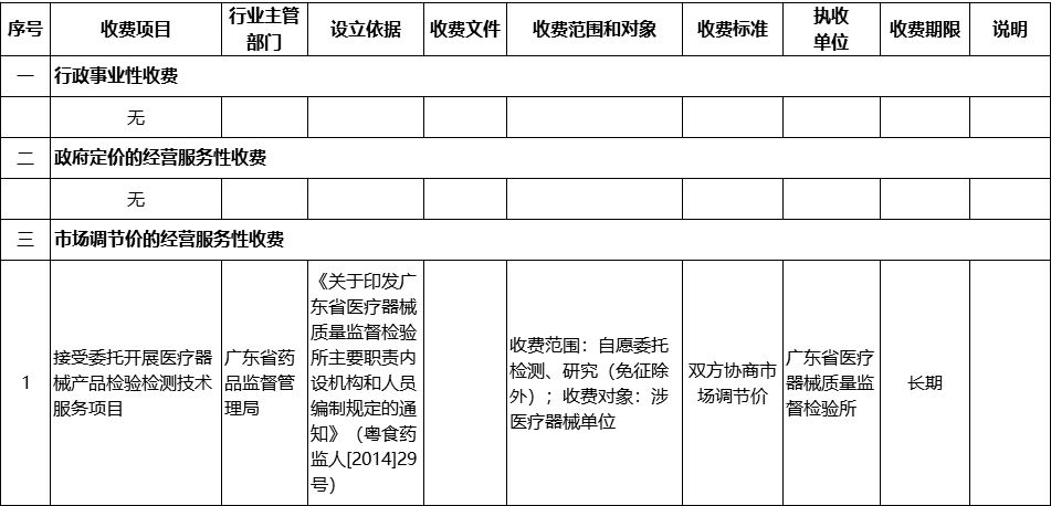 2019年3月8日,广东省药监局(局本部和直属事业单位)收费目录清单予以公布。清单中包括境内二类医疗器械注册收费目录清单、医疗器械检验所收费目录清单和包装材料容器检验中心收费目录清单,以下是详细内容: 广东省医疗器械质量监督检验所包装材料容器检验中心收费目录清单
