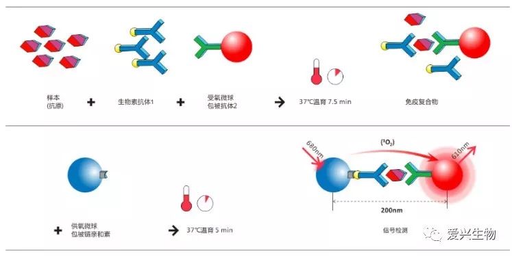 二十一世纪随着生命科学技术的飞速发展,临床化学免疫分析经历了放射免疫,酶联免疫到现在的化学发光免疫,检测技术的一步步革新将原来的手工操作带入了全自动检测时代,其检测结果的精密度和准确度也越来越高。 其中90年代初由美国科学家Ullman教授发现,并由美国德灵公司开发的LOCI(Luminescent oxygen channeling immunoassay)诊断技术,以其独特的能量转移机制和化学发光原理实现了均相免清洗,快速,高灵敏和高通量检测,并可应用于基础医学研究,DNA分子检测,食品安全以及新药开发等领域。 美国PerkinElmer公司则基于该技术开发的Alphascreen/Alphalisa至今在药物筛选方面扮演着重要的角色。遗憾的是随着德灵公司在2007年被西门子诊断以70亿美金收购后,LOCI技术的发展创新出现了停滞。 而在国内由赵卫国博士于2004年创建的博阳生物(后被科美诊断于2014年收购)首次将该技术引进国内,并开发了高通量的大型化学发光系统LICA技术平台,其在传染病项目上表现非常出色。随后于2016年成都爱兴生物在LOCI技术的基础上做了进一步创新,提升了单体氧的能量转化效率并将其应用于均相化学发光POCT系统,已取得7项产品注册证,并自主拥有核心原料和相关知识产权。 西门子诊断基于LOCI技术集成了生化和免疫一体机Dimension平台 科美诊断的LICA500光激化学发光平台 爱兴生物的LIA-12均相化学发光POCT检测平台 均相化学发光技术是一种基于两个纳米微球利用单线氧能量的短距离扩散,激发已形成的相邻位点的化学发光反应来测定生物分子之间的相互作用,它最关键的特征在于它是一种非放射性的,均相的检测分析方法,由捕获微球上生物分子的近距离结合,从一个微球到另一个微球发生了能量转移,通过化学反应并最终产生发光信号。 要了解信号是如何产生的,必须从了解微球开始。 每个发光测定包含两种微球类型:供氧微球和受氧微球。其中两种微球的表面都修饰了多糖水凝胶,使其非特异性结合和自聚集降低到最小化,并带有大量的活性基团便于和生物分子进行化学偶联。 微球是乳胶基质,直径200nm相比较基于磁珠(一般是1um和3um)的化学发光,其微球表面积成倍的增加,通常以比磁珠低得多的浓度使用,可以偶联更多的生物分子,在成本效应方面有显著的优势。微球密度(1.05g/cm3)接近于水,可以永久在水相中呈悬浮状态而不会沉淀在生物缓冲液中,并且可以使用自动液体处理装置容易地分配微球悬浮液而不会堵塞针头。 微球试剂可通过离心或者超滤来清洗,偶联生物分子后的纯化不需要色谱分离,从而获得高产率和易用性。此外即使在高温下(例如PCR用于95℃)以及冻干形式,微球试剂的表现也是非常稳定的。 均相发光原理基于每种微球内部都填充了不同的化学有机染料混合物,供氧微球含有光敏剂酞菁染料,在680nm红光的照射下,将周围环境里的氧分子转化成一种高能态活跃的单体氧(SingletOxygen)。 请注意,单体氧不是自由基,它是具有单个激发电子的单线态氧,与其他受激发分子一样,供氧微球释放出来的60000个单线态氧在回落到基态之前的寿命有限,在其4微秒半衰期内,它可在溶液中扩散的距离约为200nm。当待测物质与双抗体发生免疫反应,形成免疫复合物,其中的受氧微球与供氧微球距离小于200nm,单线态氧就会触发受氧微球里的二甲基噻吩衍生物和稀土螯合物,继而通过一系列的化学反应,最终在610nm左右产生很强的光信号。 光信号与被检测物浓度呈正相关,仪器通过浓度-相对发光值(RLU)的校准曲线,即可计算出样本中待测物质的浓度。如果样本中没有待测物质,供氧微球与受氧微球的距离将大于200nm,单线态氧降至基态且不产生信号,所以不用任何清洗,也不会带来任何的背景干扰。 均相化学发光技术集合了有机化学、高分子材料,免疫学、分子生物学,激光技术、氧自由基能量传递技术等优点,相较其他分析检测技术有着突出的优势。 高灵敏度,宽检测范围 发光信号(以每秒计数,或cps)是级联反应,其由于供氧微球内部的高浓度光敏剂在680nm激发下,每个供氧珠每秒可以释放多达60,000个单线态氧分子,从而产生非常高的信号放大。由于信号放大级联反应产生的强信号,它能够检测低至飞摩尔浓度的生物结合发生的分子相互作用。 非常低的背景 背景非常低(空孔大概100 – 200cps ),这有三个原因: 首先,以时间分辨模式进行测量,这几乎消除了所有荧光背景。 其次,读取信号的波长615nm低于激发波长680nm,存在上转换模式,避免了如血红蛋白、胆红素等杂质对检测信号的干扰,并最大程度降低了检测信号的背景值。 第三,由于照射波长在680nm处非常长,因此很少有生物或测定物质会干扰,几乎没有来自背景的自发荧光,这使得均相发光技术成为了一种高度灵敏和强大的分析技术。 精密度好 均相发光的发光效应取决于单分子氧的能量传递,而光敏剂和发光剂并不产生损耗,在一定时间内可重复检测,结果非常稳定。由于免除了非常复杂的磁珠清洗步骤,所以精密度有了很大的提升,其综合CV可以达到5%以内甚至更低。