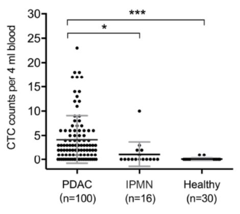浙江大学医学院附属第一医院肝胆胰外科课题组最新研究结果显示:CSV阳性间质型CTC可以有效辅助胰腺癌化疗和手术疗效监测,同时可作为监测手术后胰腺癌疾病进展及患者预后评估的手段,该研究成果已经发表在Cancer Lett.杂志(影响因子6.491)。 本研究使用杭州华得森生物技术有限公司CytoSorter® 循环肿瘤细胞检测系统,结合基于细胞表面波形蛋白(Cell Surface Vimentin, CSV)的间质型CTC富集检测试剂,高效完成胰腺导管腺癌(PDAC)外周血CTC分选和鉴定。相较于上皮性肿瘤细胞标记物(EpCAM),基于细胞表面波形蛋白(CSV)的PDAC循环肿瘤细胞(CTC)富集检测效率更高。CytoSorter CSV CTC捕获系统对PDAC患者CTC的检出率可达76%(76/100),而CellSearch EpCAM CTC捕获系统在PDAC患者的检出率只有6-30%。 本研究以CTC数量2为阈值,CSV阳性间质型CTC在PDAC、良性胰腺癌(IPMN)及健康人的阳性率分别为65%﹑25%及0%,CSV阳性间质型CTC检测可明显地区分PDAC患者和健康人,这为CTC辅助胰腺癌早期筛查奠定了一定的液体活检基础。 CSV阳性间质型CTC在胰腺癌临床诊断上是个可靠的生物标志物。相对于CSV阳性间质型CTC未检出或只检出1颗的患者,CTC检出超过2颗的PDAC患者通常有较晚期的疾病。相对于局部病灶的PDAC患者,有转移性病灶的PDAC患者CSV阳性间质型CTC更多。16位PDAC患者在手术前后进行了CSV阳性间质型CTC检测,14位患者在术后皆有大幅度的CSV阳性间质型CTC数目降低。15位进行化疗的PDAC患者,有13位疾病好转,肿瘤缩小了,其中12位的CTC数目降低或维持不变;疾病进展的2位患者,其CSV阳性间质型CTC数目显著增加。 CSV阳性间质型CTC计数与可切除肿瘤PDAC患者的肿瘤负担变化相关。对化疗有反应的PDAV患者,在化疗后可观察到CSV阳性间质型CTC计数显著降低。术前有较多CSV阳性间质型CTC的患者有较短的无复发生存期。 另外,本研究还显示CSV阳性间质型CTC检测与CA 19-9检测的联合使用可大幅增加对PDAC患者的诊断效力 (AUC=0.968)。 本研究证实杭州华得森生物CytoSorter® 循环肿瘤细胞检测系统可以用于肿瘤临床诊断,CSV阳性间质型CTC检测对于胰腺癌患者化疗疗效和疾病进展监测,具有一定的临床诊断指导价值。CSV阳性间质型CTC的富集可让临床工作者更深入了解CTC在PDAC上的生物学和临床意义。 参考文献: Wei T, Zhang X, et al. Vimentin-positive circulating tumor cells as a biomarker for diagnosis and treatment monitoringin patients with pancreatic cancer[J]. Cancer Lett. 2019 Mar 21. pii: S0304-3835(19)30165-X. doi: 10.1016 中国CTC 产业联盟,是由国内10 家CTC 研发型企业共同发起,于2016年9月30日正式成立的行业联盟。联盟的宗旨是“促进CTC的学术交流,推动CTC的临床应用,建立CTC的行业标准”,为我国肿瘤患者以及癌症高危人群的慢病防治做出贡献。组成联盟的公司为北京博奥晶典生物技术有限公司、北京中科纳泰生物科技有限公司、杭州华得森生物技术有限公司、益善生物技术股份有限公司、珠海丽珠圣美医疗诊断技术有限公司、上海柏慧康生物科技有限公司、宜昌美光硅谷生命科技股份有限公司、广州安方生物科技有限公司。