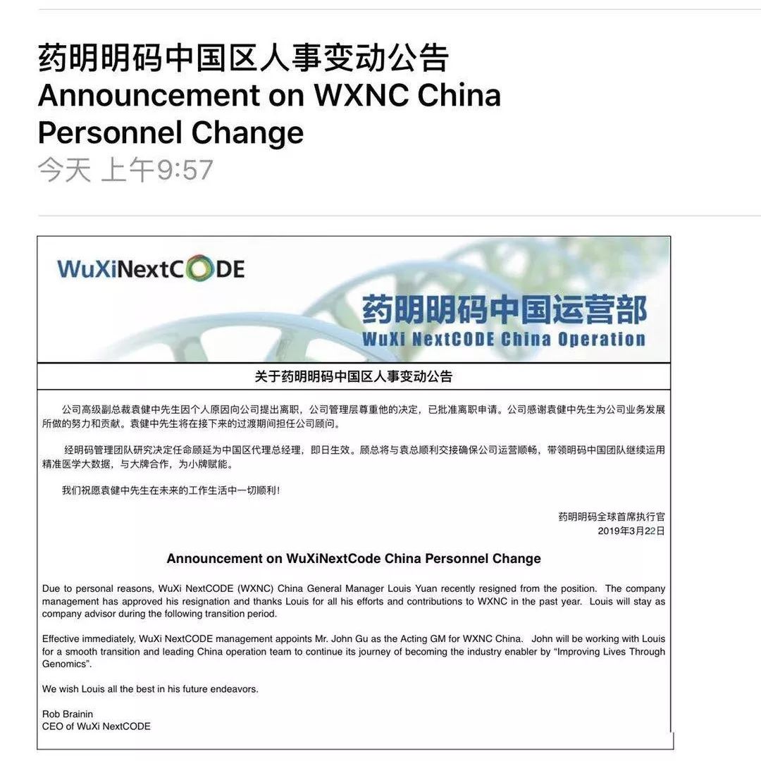 信中提到,药明明码在2018年12月19号举行了一次全体员工参加的名为“回顾2018 展望2019”的会议,在会议上,总经理袁健中宣布要进行业务调整和组织结构优化。