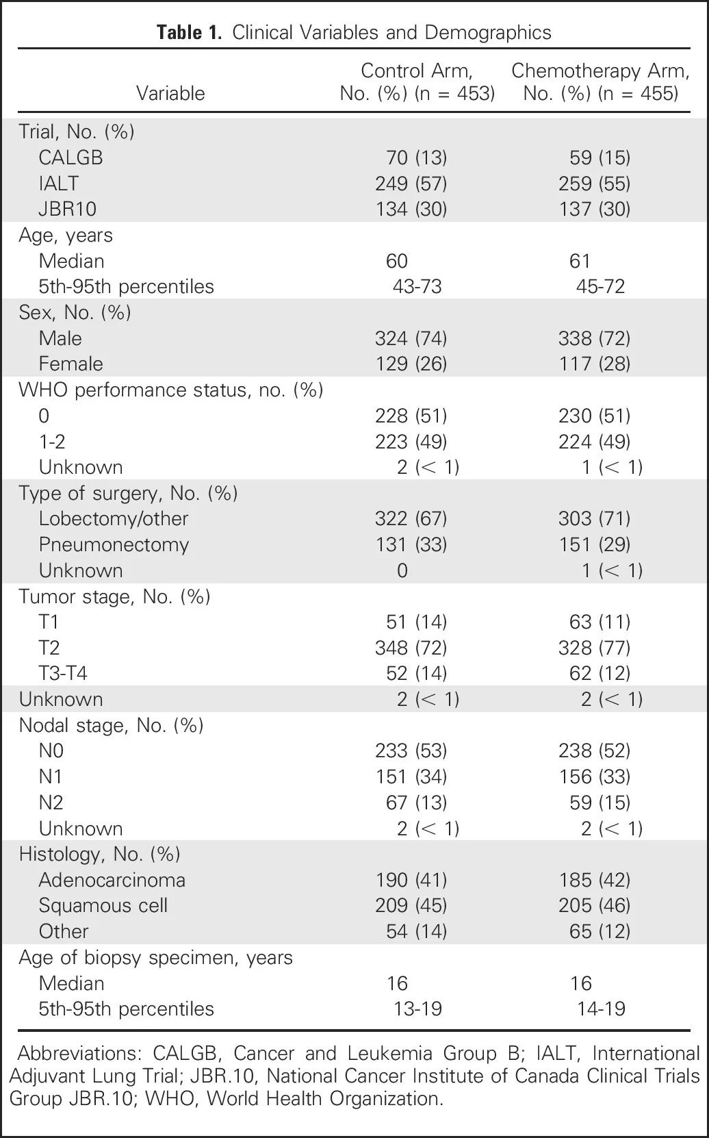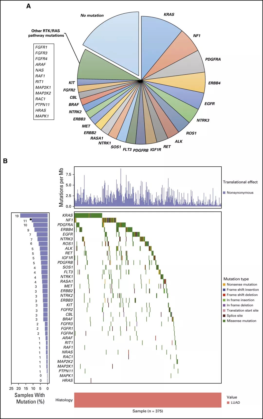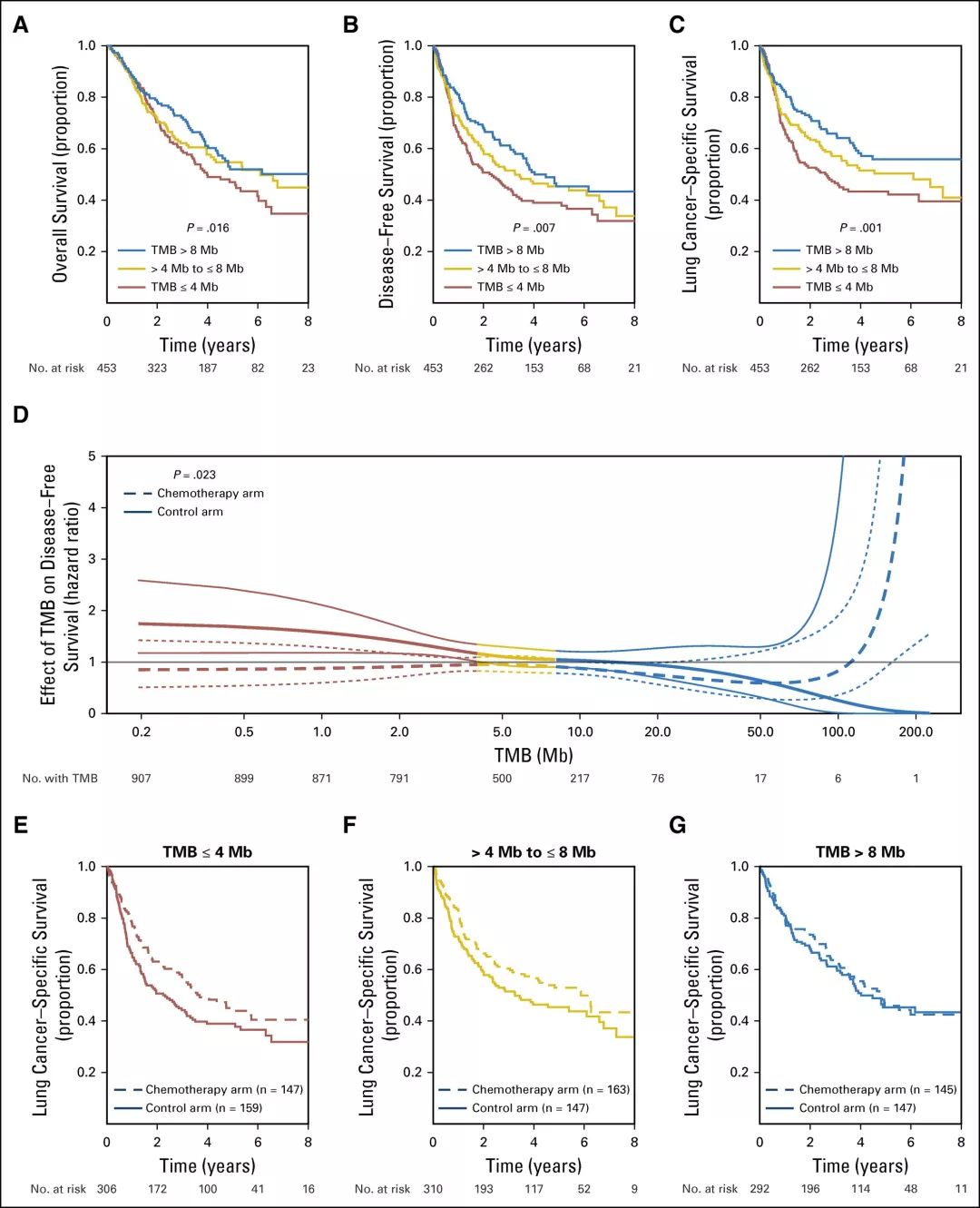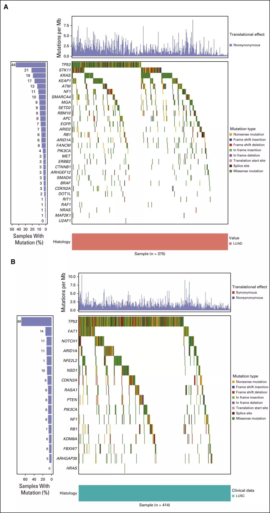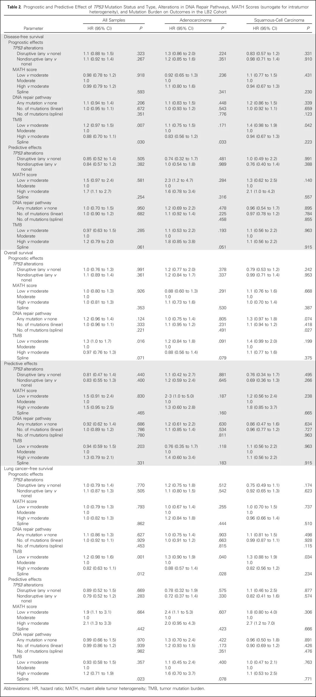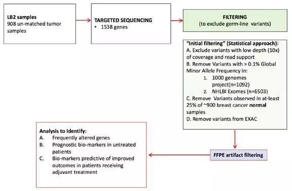 研究背景 术后Ⅱ-Ⅲ期NSCLC患者使用化疗辅助治疗具有一定的生存获益。但是对于这类患者的预后或预测的生物标志物的检测尚未在临床应用。本研究报道了肺癌顺铂辅助治疗评估LACE-Bio-II(LB2)研究的结果,分析了辅助治疗标志物临床试验中的>900例早期NSCLC患者的NGS检测和长期生存数据。我们使用靶基因panel来评估单基因突变、DNA修复途径和肿瘤突变负荷(TMB)的预后和预测效应。 研究方法 来自LB2研究的908个不匹配的术后NSCLC患者FFPE样本,使用1538靶基因panel进行NGS检测。使用严格的过滤标准排除福尔马林固定相关的胚系变异和假阳性。 在通过试验分层的Cox模型中评估无病生存期、总生存和肺癌特异性生存(LCSS),此模型可针对治疗方式、年龄、性别、表现评分、组织学、手术类型和分期进行调整。检测平台为Illumina HiSeq 2000。由于同义突变的功能改变是不确定的,所以本研究分析中只包括了非同义突变。错义、无意义、剪接位点和移码突变被认为是非同义的。少于20个样本的非同义突变在基因特异性预后分析中被剔除。 附图:LB2分析流程 研究结果 1、样本信息,人口统计学和临床特征 本研究纳入了三个LB2研究的1608名患者,其中1008名患者的FFPE样本含有足够的肿瘤细胞。排除了组织数量或者质量不达标的样本之后,剩余908名患者的样本进行1538靶基因panel测序,该panel基于癌症基因组图谱(TCGA)泛癌症分析选定;其中27%为女性(见表1)。确诊的中位年龄为60岁(27-81岁)。大部分患者为Ⅱ期(n=676;75%),12.5%为Ⅰ期(n=114),12.5%为Ⅲ/Ⅳ期(n=114)。三个LB2研究中,只有两个可知入组患者的吸烟历史。 表1:患者基线特征 2、TMB和高频突变基因 在额外排除了低VAF(变异等位基因频率)的C>T转换之后,中位非同义TMB为5.7/Mb(范围0.19-225/Mb;四分之一间距3.2-9.7/Mb;数据见附录)。 错义变异(38%)是最常见的变异类别。 其他非同义突变发生率较低,包括无意义(3.5%)和剪接位点(4%)变异。 本研究鉴定了TCGC LUAD(肺腺癌)和LUSC(肺鳞癌)亚组的突变基因清单,并且将这些基因在TCGA和LB2样本中的突变频率进行了比较。结果表明大部分的突变频率是一致的(图1)。在LB2样本中,LUAD与LUSC显著不同的突变基因是KRAS(19% v 2%)、TP53(44% v 69%)、STK11(21% v 2%)。 图1:瀑布图显示来自LACE-Bio II队列的(A)LUAD(n = 375)和(B)LUSC(n = 414)样本的基因突变频率和突变类型在癌症基因组图谱队列中处于统计显著学水平。 在近70%(n = 265)的LUAD样本中发现了受体酪氨酸激酶/ RAS信号传导通路的突变(图2)。在LUAD样本中,KRAS是最常见的突变致癌基因(19%;n=72)。 正如预期的那样,在3%的LUSC样本中发现了KRAS、HRAS、NRAS和EGFR激活突变。 LB2队列的一个LUSC样本中发现了EGFR L858R突变。 图2:(A)大约70%的LUAD样本在RTK/RAS/RAF通路中发现了至少一个突变。 (B)LACE-Bio II队列中所有LUAD样本在以上这些突变基因的整体分布。 各个基因的突变频率是有重叠的(总和并非100%)。 LUAD,肺腺癌。 3、预后和预测分析 考虑到LB2样本检测的仅仅是1538个基因,并且只考虑非同义突变,本研究评估了用有限的基因panel检测得到的TMB来替代全外显子测序得到的TMB的可行性。最终将结果限定在1214个LB2基因,这些基因可以映射回TCGA数据集,包括所有关键的癌基因。非同义TMB与DFS、OS、LCSS预后显著相关(表2)。所有肿瘤样本基于TMB水平分为三类(低,≤4mutations/Mb;中,<4mutations/Mb 且≤8mutations/Mb;高,>8mutations/Mb),高TMB组预后最好,低TMB组预后最差(DFS、OS、LCSS的P值分别为0.007、0.016、0.001)。TMB与LUAD、LUSC的LCSS均显著相关。探索性分析表明,当使用一个更灵活的模型时,TMB可能可以作为LCSS的一个显著预测因子(P=0.023;表2,图3),但不适用于DFS或OS。这个模型适用于所有组织类型的汇总分析,但不适用于LUAD或者LUSC的单独分析。这个模型表明对于低TMB样本,用TMB来预测化疗辅助治疗的LCSS获益是最佳的,随着TMB增加预测作用反而降低。然而,这个结果可能受到了少数极高TMB的样本的影响,并且线性趋势在三组不同水平TMB的亚组中没有显著性。 肿瘤MATH评分与LB2生存期无显著的预后或预测相关性。TILs密度与TMB或MATH评分均无统计学相关性。908个样本中,805个样本基于肿瘤及基质中的PD-L1表达水平(使用E1L3N抗体)进行了分类,阈值分别为<1%、<25%、<50%和<1%、<10%、<25%。高TMB或MATH评分与PD-L1表达水平并非正相关,尽管基质中的PD-L1表达与高密度TIL浸润具有相关性。 总计571个样本(60%)中检测到了TP53突变。TP53突变的存在,不管是破坏性的还是非破坏性的,既不是预后也不是预测性的标志物。DNA修复路径的突变对于化疗辅助治疗既不是预后也不是预测性的标志物。 表2:LB2队列中TP53突变状态和突变类型、DNA修复途径的改变、MATH评分(代表肿瘤内异质性)、TMB对于生存期的预后和预测效应 图3:Kaplan-Meier曲线显示所有肿瘤样本中非同义TMB对于(A)总生存、(B)无病生存期、(C)肺癌特异性生存(LCSS)的预后效应。(D)当使用更灵活的“样条”模型时,TMB与化疗辅助治疗LCSS获益的风险比。 (E-G)不同水平TMB下,非同义TMB对于LCSS的预测效应(P =0.357)。 TMB,肿瘤突变负荷。 讨论 本研究表明,高非同义TMB与更好的预后具有显著相关性,低非同义TMB可用来预测化疗辅助治疗的LCSS获益。然而,本研究的结论需要谨慎解读,因为这个结果可能受到了少数极高TMB的样本的影响,并且线性趋势在三组不同水平TMB的亚组中没有显著性。尽管OS和DFS的预测作用不显著
