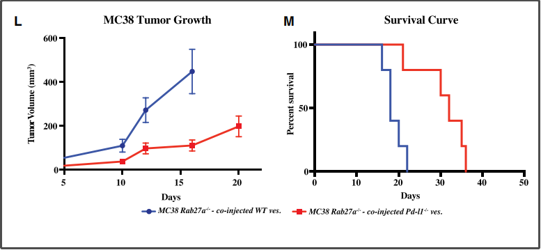 在利用CRISPR基因编辑技术敲除产生外泌体的相关基因后,原本免疫检查点抑制剂耐药的肿瘤模型小鼠,竟然在接受免疫治疗后产生明显的效果!在抑制外泌体形成和PD-1/PD-L1抑制剂的联合治疗下,小鼠的生存时间明显较单一疗法显著延长。