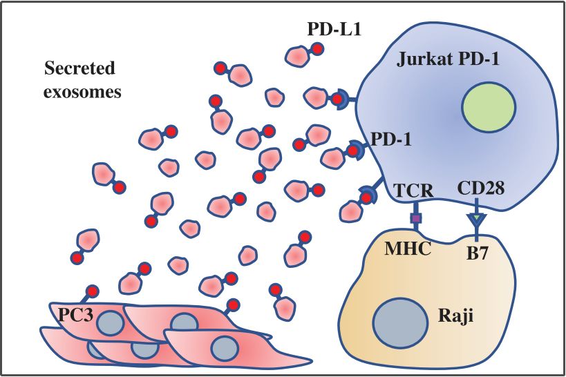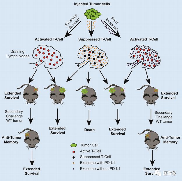 真实情况是,这些癌细胞不仅早就表达了大量的PD-L1蛋白,并且成功通过外泌体携带这些蛋白“潜逃”!外泌体在穿越淋巴和血液系统后,最终将PD-L1蛋白转运至人体免疫细胞的激活部位——淋巴结。 外泌体携带PD-L1潜逃
