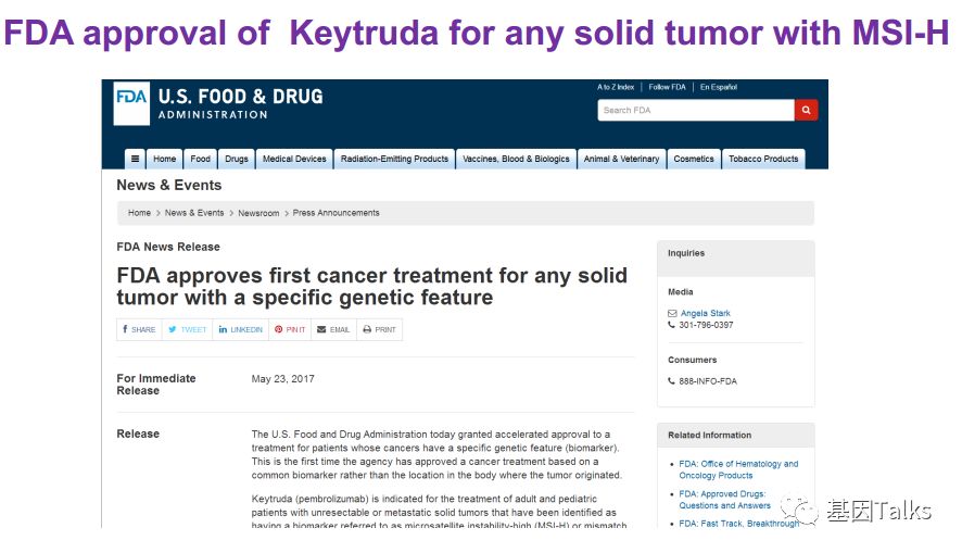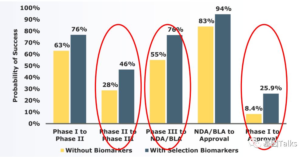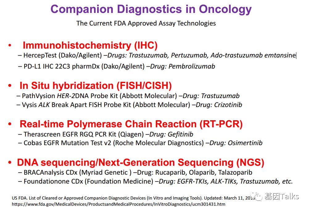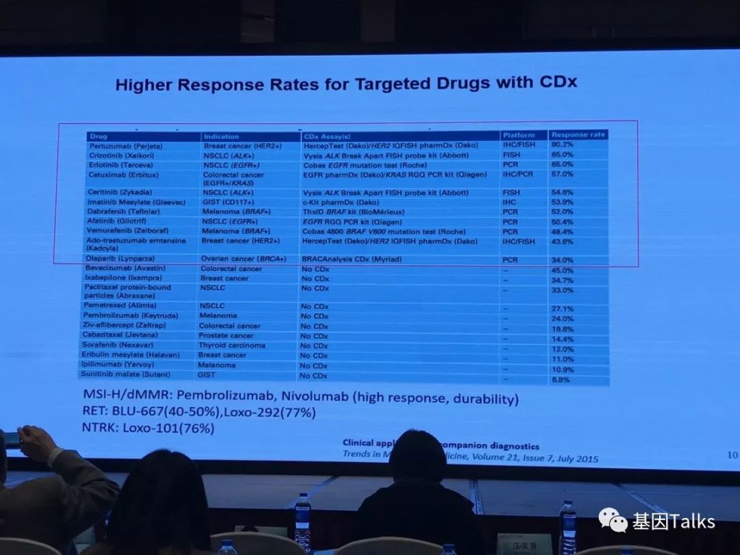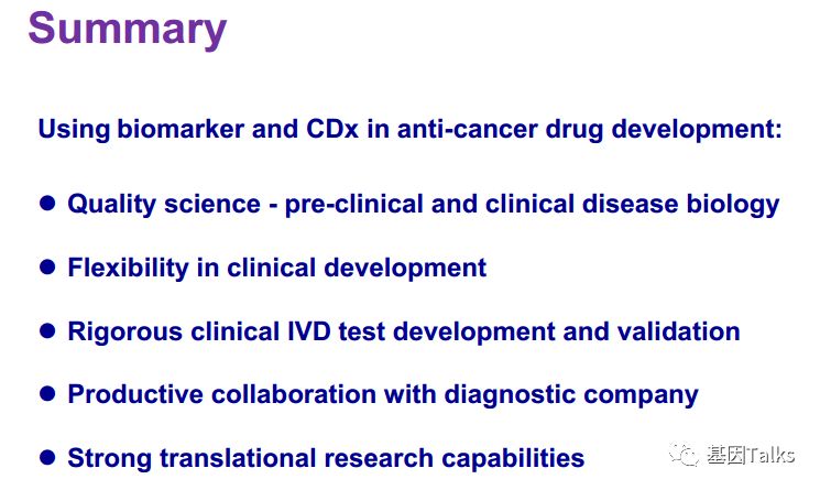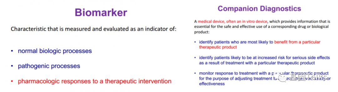 随着生物标志物(Biomarker)的不断发展与使用推广,目前,生物标志物在肿瘤药物发现与开发的早期临床应用及上市获批中起着重要的作用,许多生物标志物正在不断向伴随诊断(Companion Diagnostics,CDx)试剂的方向开发。 那么,生物标志物及伴随诊断在肿瘤创新药物开发中有着什么样的作用呢?今天跟大家分享来自2019第二届伴随诊断&液体活检创新峰会上某位专家的演讲内容:“生物标志物及伴随诊断在肿瘤创新药物开发中的作用”。 生物标志物(Biomarker)是一种可客观检测和评价的特性,可作为正常生物学过程、病理过程或治疗干预药理学反应的指示因子。 伴随诊断(Companion Diagnostics,CDx)是一种体外诊断技术,能确定哪些患者最有可能受益于特定的治疗产品;确定哪些患者可能因治疗而发生严重的副作用;监控治疗反应,以便调整治疗,使安全性和有效性得以改善。 ▲ Biomarker & CDx 生物标志物与伴随诊断有着密切的关系,但是并不等同:生物标志物仅仅与生理过程相关,伴随诊断则有具体的使用用途、性能特征以及与使用目的相关的安全性和有效性等。 生物标志物能预测患者是否能从药物获益,例如,EGFR突变的患者能从EGFR-TKI药物中获益,无EGFR突变的患者则不能获益,这就是预测生物标志物。伴随诊断的用途就是检测这些生物标志物,通过比较生物标志物阳性和阴性群体患者的药物效果来支持生物标志物与药效预测的最大相关性。 制药公司在开发新药,尤其是抗肿瘤药物时,常常会发现药物对某些特定的患者人群是有效的,而对其他人群则无效。 这时候正确的选择生物标志物,将会大大提高药物的临床试验及上市的成功率:选择了生物标志物的情况下,I 期到 II 期药物临床试验成功率可以从 63% 提高 至 76%;II 期到 III 期药物临床试验成功率可以从 28% 提高至 46%;III 期到NDA(新药申请)的成功率可以从 55% 提高至 76%;NDA到获批上市的成功率药可以从 83% 提高至 94%。综合可见:如果选择了生物标志物,一个新药从临床试验 I 期 到获批上市的成功率可以从 8.4% 提高至 25.9%! ▲ 是否选择生物标志物将会影响一个药物的临床乃至上市成功率 目前,FDA批准在肿瘤学领域的伴随诊断技术主要有: 1,免疫组化(IHC):K药与PD-L1 22C3抗体等; 2,原位杂交(FISH/CISH)*:克唑替尼与雅培ALK FISH产品等; 3,荧光定量PCR(RT-PCR):奥西替尼与罗氏 Cobas EGFR产品等; 4,二代测序(NGS):EGFR-TKIs,ALK-TKIs等与 F1 CDx产品等; *FISH:荧光原位杂交,CISH:显色原位杂交。 ▲ FDA批准在肿瘤学领域的伴随诊断技术 1,吉非替尼与EGFR突变 2014 《NEJM》:EGFR激活突变的发现。在9例吉非替尼反应性肺癌患者中,有8例患者的EGFR基因酪氨酸激酶域发生了体细胞突变,而在7例无反应性肺癌患者中没有一例发生EGFR体细胞突变。 ▲ 2014《NEJM》报道吉非替尼与EGFR突变关系 ▲ 2019《NEJM》报道的亚洲人群吉非替尼 IPASS研究 2,ALK抑制剂与ALK,ROS1,MET-14跳跃 如果说EGFR抑制剂从研发到EGFR突变生物标志物的发现过程是个乘坐绿皮火车的过程(90~09年),那么ALK抑制剂从研发到ALK融合生物标志物的发现过程则是个乘坐高铁的过程(05~11年)。 ▲ 吉非替尼、克唑替尼与相关生物标志物的获批时间 随后,克唑替尼与ROS1,MET的突变生物标志物被陆续发现: ▲ 克唑替尼与ROS1,MET的突变生物标志物发现与应用 3,PD-1/PD-L1抑制剂与PD-L1,MSI,TMB等 ▲ PD-1/PD-L1抑制剂与PD-L1 ▲ PD-1抑制剂 K药与dMMR/MSI ▲ PD-1抑制剂 O药与TMB ▲ FDA批准的药物伴随诊断产品 2018-2019年新的生物标志物或伴随诊断有:拉罗替尼(LOXO-101)与NTRK融合;LOXO-292与RET融合与点突变。 ▲ 拉罗替尼(LOXO-101)与NTRK融合 ▲ LOXO-292与RET融合与点突变 生物标志物和CDx在抗癌药物开发中的应用: 1,科学质量-临床前和临床疾病生物学特征; 2,临床发展的灵活性; 3,严格的临床IVD测试开发和验证; 4,与诊断公司进行富有成效的合作; 5,较强的转化研究能力。 |