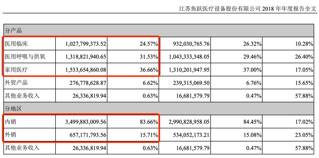 其中,鱼跃主要用于制氧机、电子血压计、呼吸机等家用器械产品;华佗主要用于针灸针等中医器械;金钟主要用于医用手术器械产品;安尔碘系控股子公司上海中优品牌,现已成为国内医疗行业皮肤消毒剂的标注术语之一;普美康隶属于德国子公司Metrax,在全球医疗急救行业具备较高的知名度。 报告中的经营数据显示,医用临床、医用呼吸与供氧、家用医疗依然是鱼跃的三大产品线,营收均超过10亿元,以家用医疗器械为最多达到15.3亿元,同比去年增长17.05%,并占据总营收的36.66%。 从分地区销售情况看,国内市场依然是鱼跃医疗的主战场。2018年,其国内市场营收为约35亿元,占据总营收的83.66%;国外市场营收约6.5亿元。