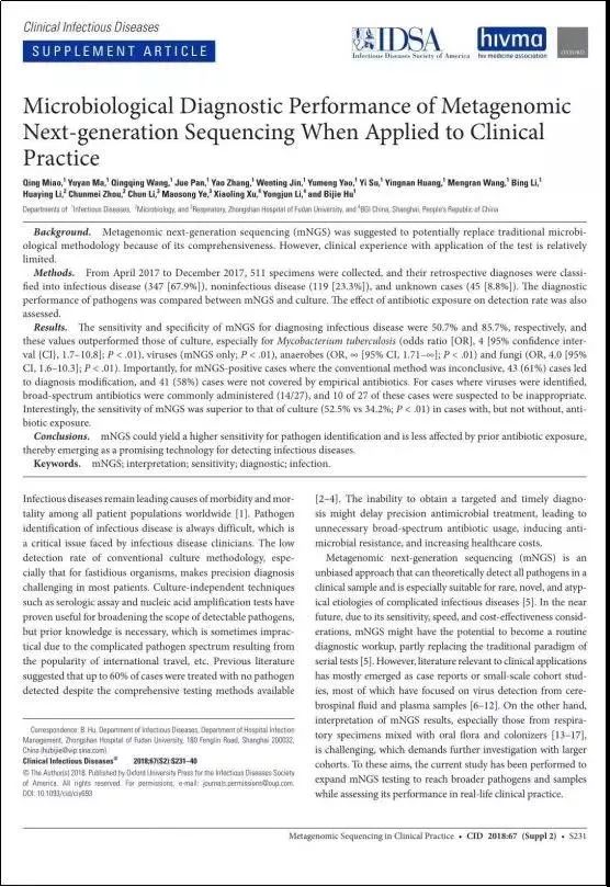 会上复旦大学附属中山医院感染病科胡必杰教授团队的姚雨濛/缪青主治医生报告了题目为“大数据:病原二代测序的临床应用实践”(Microbiological Diagnostic Performance of MetagenomicNext-generation Sequencing When Applied to Clinical Practice)的演讲,相关研究成果已在Clinical Infectious diseases 杂志发表(IF-9.117)。研究证明mNGS在感染病检测领域潜力无限,未来将大有所为。