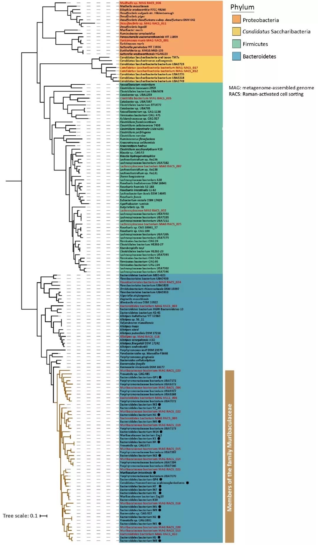 最后,将小鼠结肠微生物组的细胞使用粘蛋白在有重水条件进行培养,使得代谢粘蛋白的细胞被氘标记,使用RACS平台分选了180个细胞(如图4a所示),然后使用宏基因组学的方法进行分析。16S分析结果显示分选获得的物种在原群落中占比为27.4 ± 6.8%,而在RACS平台捕获的细胞里,最终确定为氘标记并分选的细胞占比23.7 ± 9.9%,这两个比率十分一致再次证明了RACS平台的可靠性。粘蛋白降解有关的微生物具有较高的系统发育多样性,属于4个门类Bacteroidetes、Firmicutes、Proteobacteria和CandidatusSaccharibacteria(如附件图4所示)。