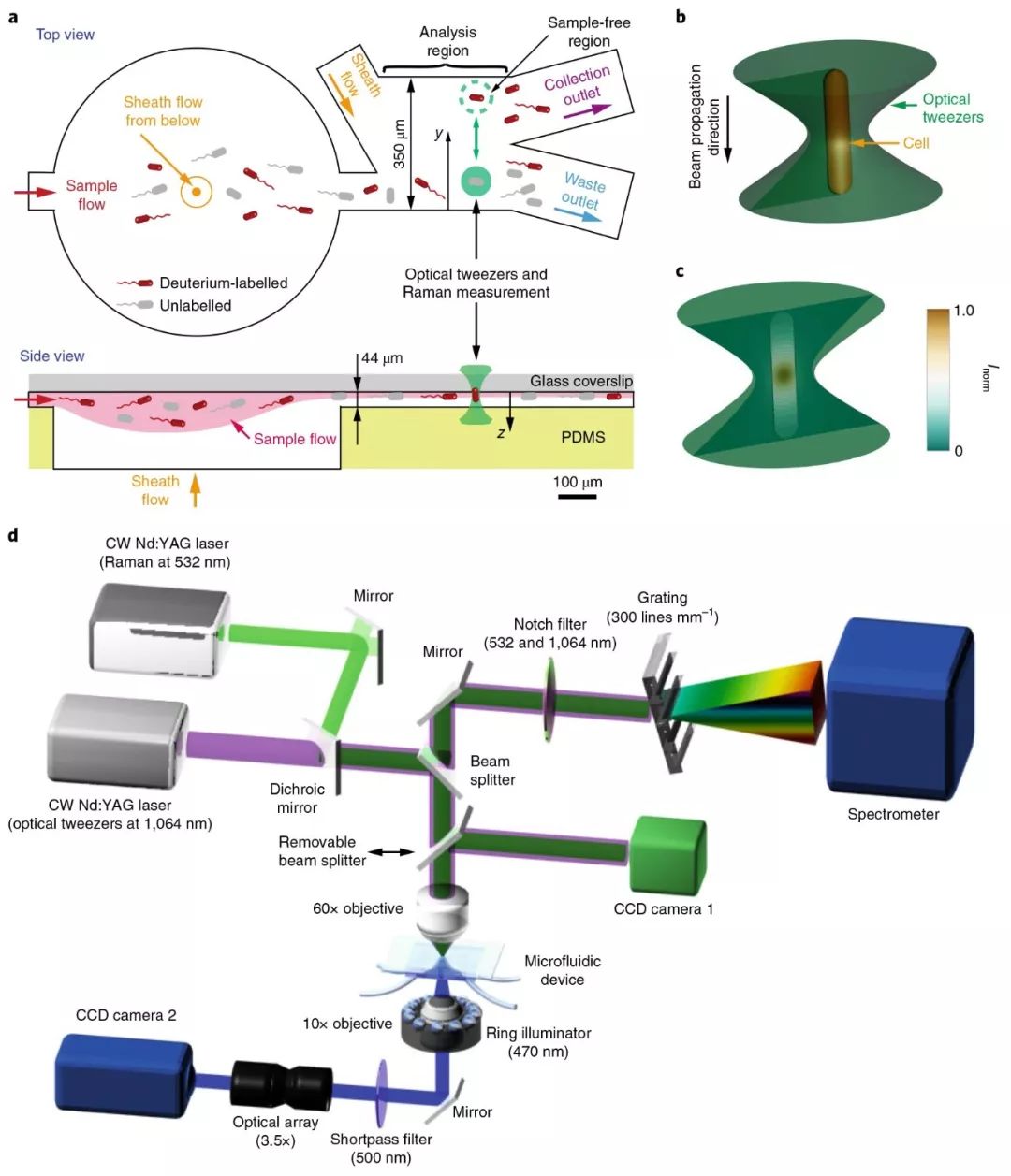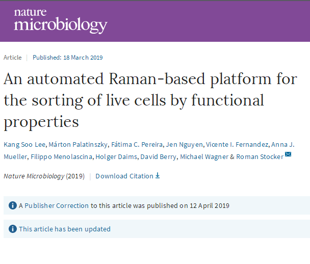 2019年3月《Nature microbiology》期刊上,“自动化拉曼光谱仪用于活细胞功能分类”介绍了一个微流控光学平台结合了微流体、光镊和拉曼光谱技术,用于对稳定同位素标记的微生物细胞进行自动化分类,可以产生适合后续单细胞基因组学、微型宏基因组学以及纯培养的活细胞。