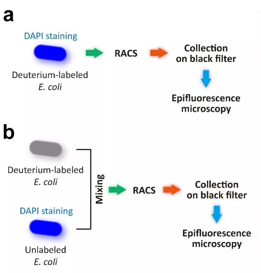 接下来作者进一步通过实验评估RACS平台。首先评估回收效率,也即实际收集出口收集到的细胞数目与平台检测出氘标记细胞信号的数目之比。作者将氘标记的大肠杆菌细胞使用DAPI染色(附件图2a所示),然后输入平台进行连续一小时的运行分选,收集到的细胞在荧光显微镜下进行计数,最终计算可得回收效率为82.1± 2.7%。接下来评估分选准确率,作者将没有氘标记的大肠杆菌细胞用DAPI染色,并与氘标记的细胞进行1比1混合(附件图2b所示),然后输入平台连续一小时的运行分选,然后检测收集的细胞中DAPI染色细胞(也即未标记细胞)的数目,最终结果为准确率98.3± 1.7%。