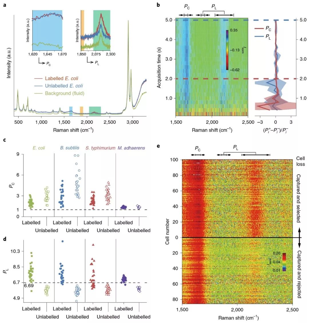 图3. RACS平台示例菌株及分选标准(a. 背景流体与标记和未标记的大肠杆菌细胞拉曼光谱比较,彩色条带分别展示了计算PC与PL所依据的波谱区域 b. 氘标记的大肠杆菌细胞PC与PL指数随测量时间的变化,热图为标准化的拉曼光谱 c. 四个测试的物种其标记与未标记细胞的PC指数对比 d. 四个测试的物种其标记与未标记细胞的PL指数对比 e. 准确率评估测试中检测的185个大肠杆菌细胞拉曼光谱对比)