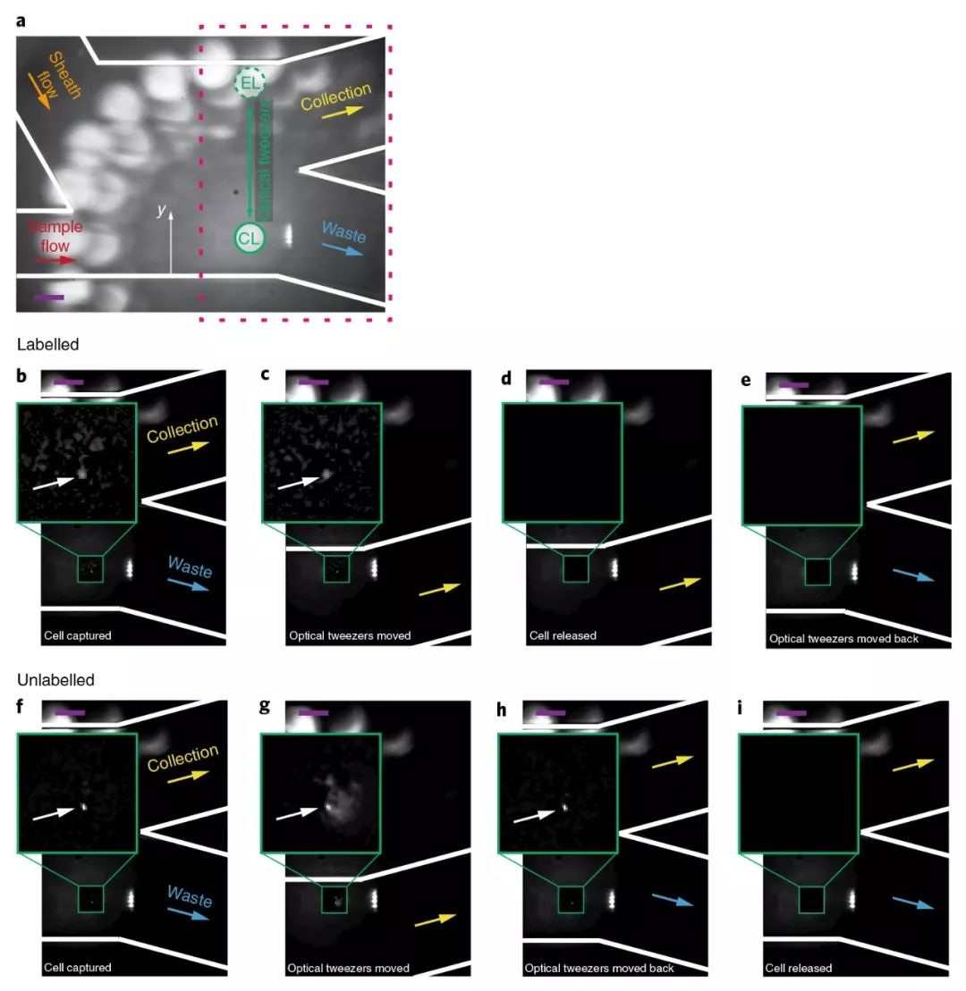 图2. 微流控装置内的细胞分选操作(a. 微流控分选的监控图,因为装置反光,光镊周围可以看到环形照明灯,CL为捕获区域,EL为评估区域,光镊在这两个区域之间往复移动 b-e. 氘标记细胞的分选过程,最终在评估区域释放被带入收集出口 f-i. 未标记细胞被带回捕获区域释放,被带入废液出口)