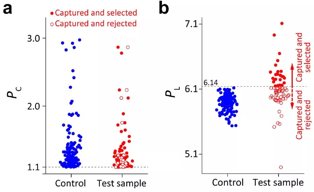 如图3b所示,经过反复测量显示细胞拉曼光谱测量时间越长,PL与PC值越稳定,PC值需要2秒时间测量足以稳定,而PL值需要5秒时间。根据这个参数,全自动化的RACS平台分选细胞的速度达到200细胞每小时(也即3.3细胞每分钟)。