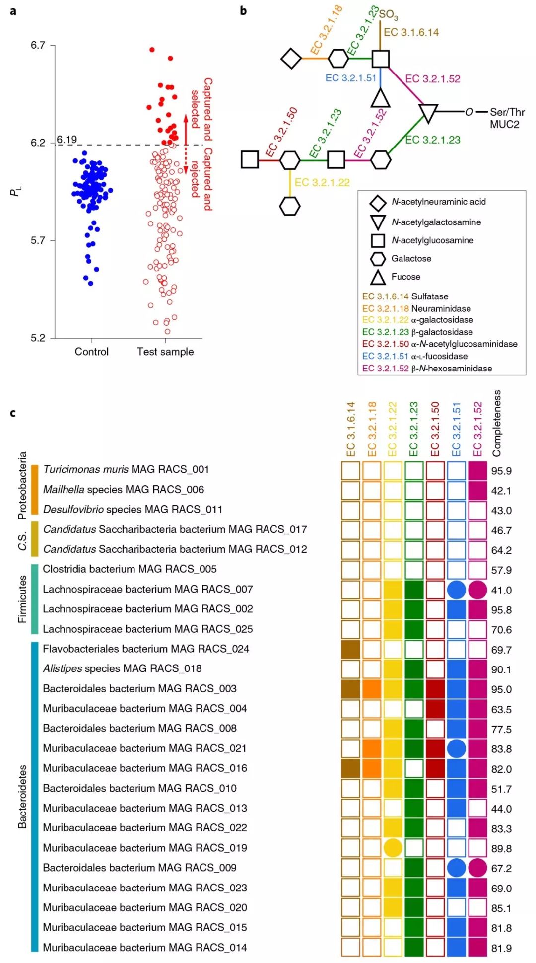 图4. 使用RACS平台分析小鼠结肠微生物组中与粘蛋白降解有关的微生物(a. 降解粘蛋白的标记细胞的判断标准及其分选结果 b. 粘蛋白降解的代谢通路及相关的酶 c. 获得的25个基因组中粘蛋白降解酶的出现情况,实心方块表示在基因组中出现,实心圆圈表示在该基因组最近缘的物种中又出现,空心方块表示不出现)